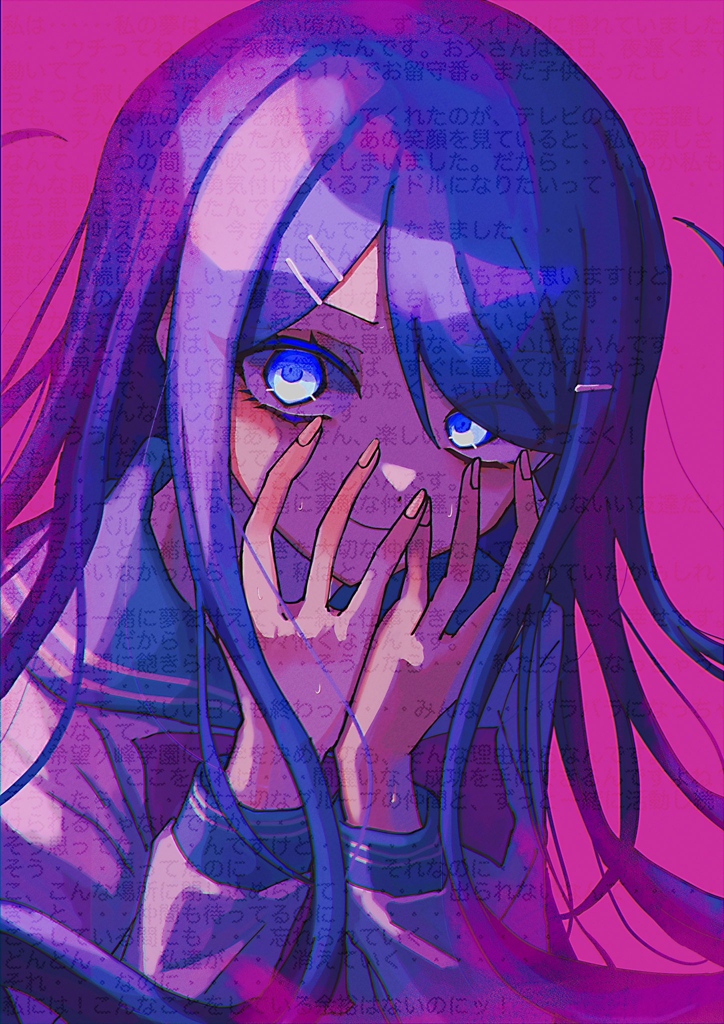 1girl blue_eyes blue_hair bow bowtie closed_mouth commentary_request danganronpa:_trigger_happy_havoc danganronpa_(series) donburi_(minami_don) hair_ornament hairclip hands_up highres long_hair long_sleeves looking_at_viewer maizono_sayaka pink_background sailor_collar shirt simple_background smile solo translation_request upper_body