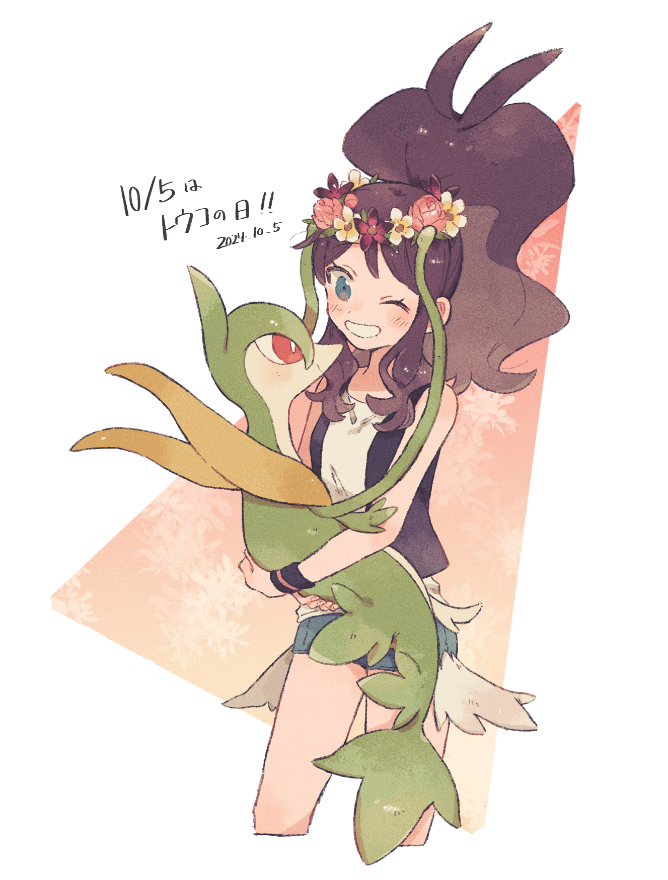 1girl black_vest blush brown_hair character_name commentary dated exposed_pocket flower_wreath gen_5_pokemon grin high_ponytail highres hilda_(pokemon) hime_(himetya105) holding holding_pokemon long_hair nintendo one_eye_closed open_clothes open_vest pokemon pokemon_(creature) pokemon_bw ponytail servine shirt short_shorts shorts sidelocks sleeveless sleeveless_shirt smile teeth vest white_shirt