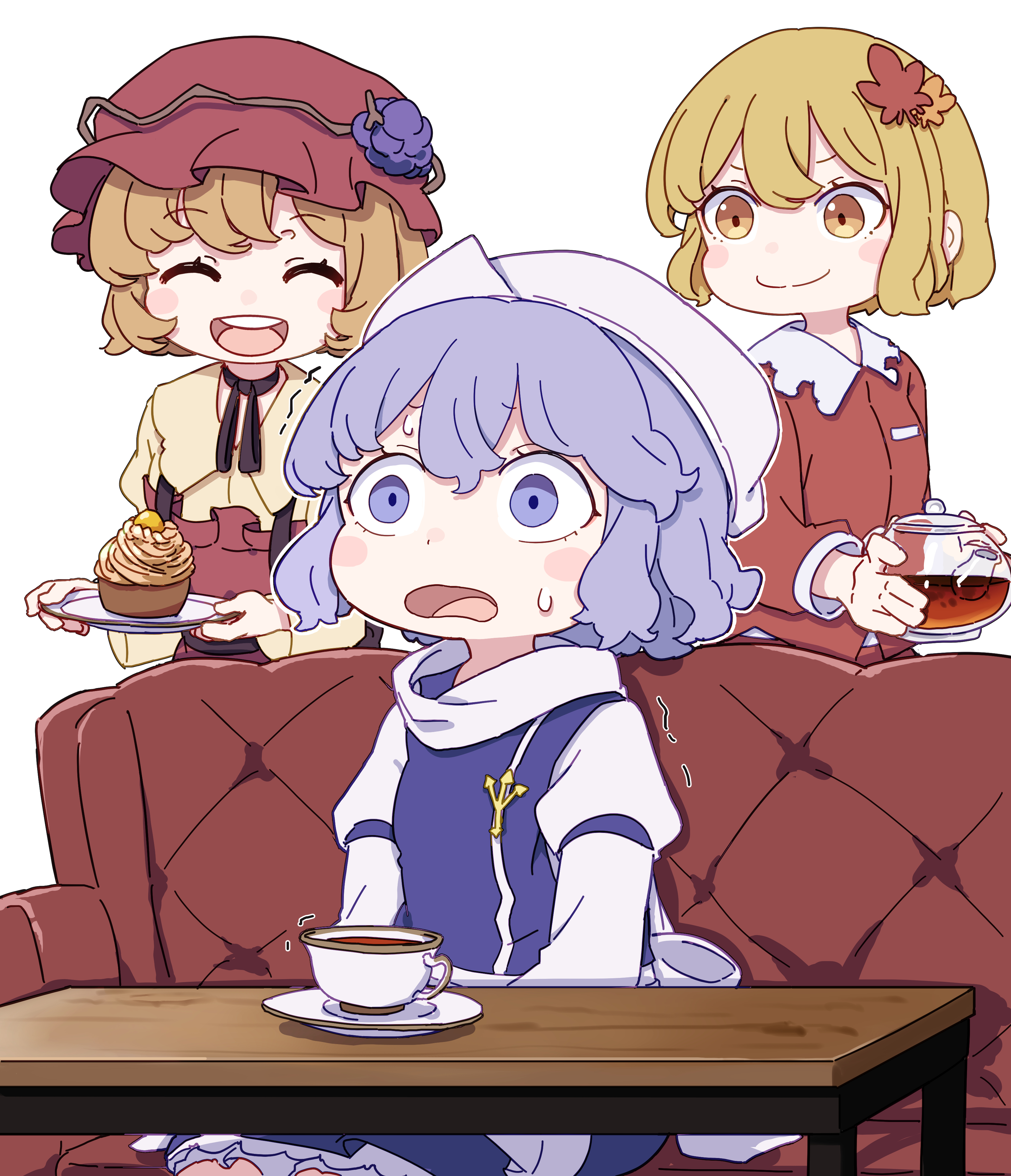 3girls absurdres aki_minoriko aki_shizuha blonde_hair cake changing_seasons_(touhou) couch food grape_hat_ornament hat highres holding holding_plate kame_(kamepan44231) letty_whiterock multiple_girls on_couch plate purple_hair red_hat sitting smile sweat touhou white_background