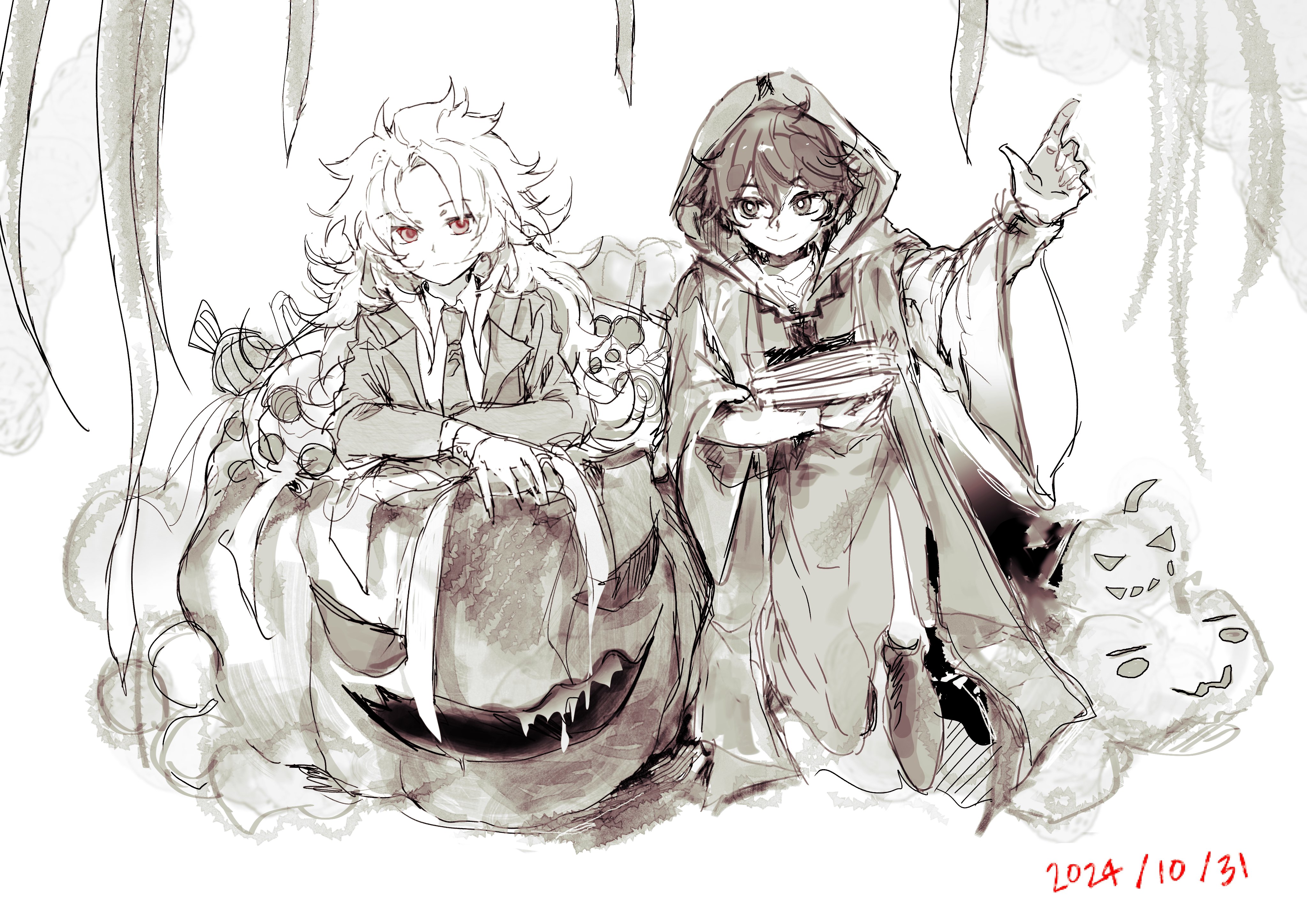 2boys absurdres arm_up bright_pupils closed_mouth collared_shirt dated goodnightnonnon hair_between_eyes halloween hatsutori_hajime highres hood hood_up hooded_coat jack-o'-lantern jacket lapels long_hair long_sleeves male_focus monochrome multiple_boys necktie notched_lapels open_clothes open_jacket parted_bangs pumpkin red_eyes saibou_shinkyoku shirt short_hair sketch smile spot_color utsugi_noriyuki wide_sleeves