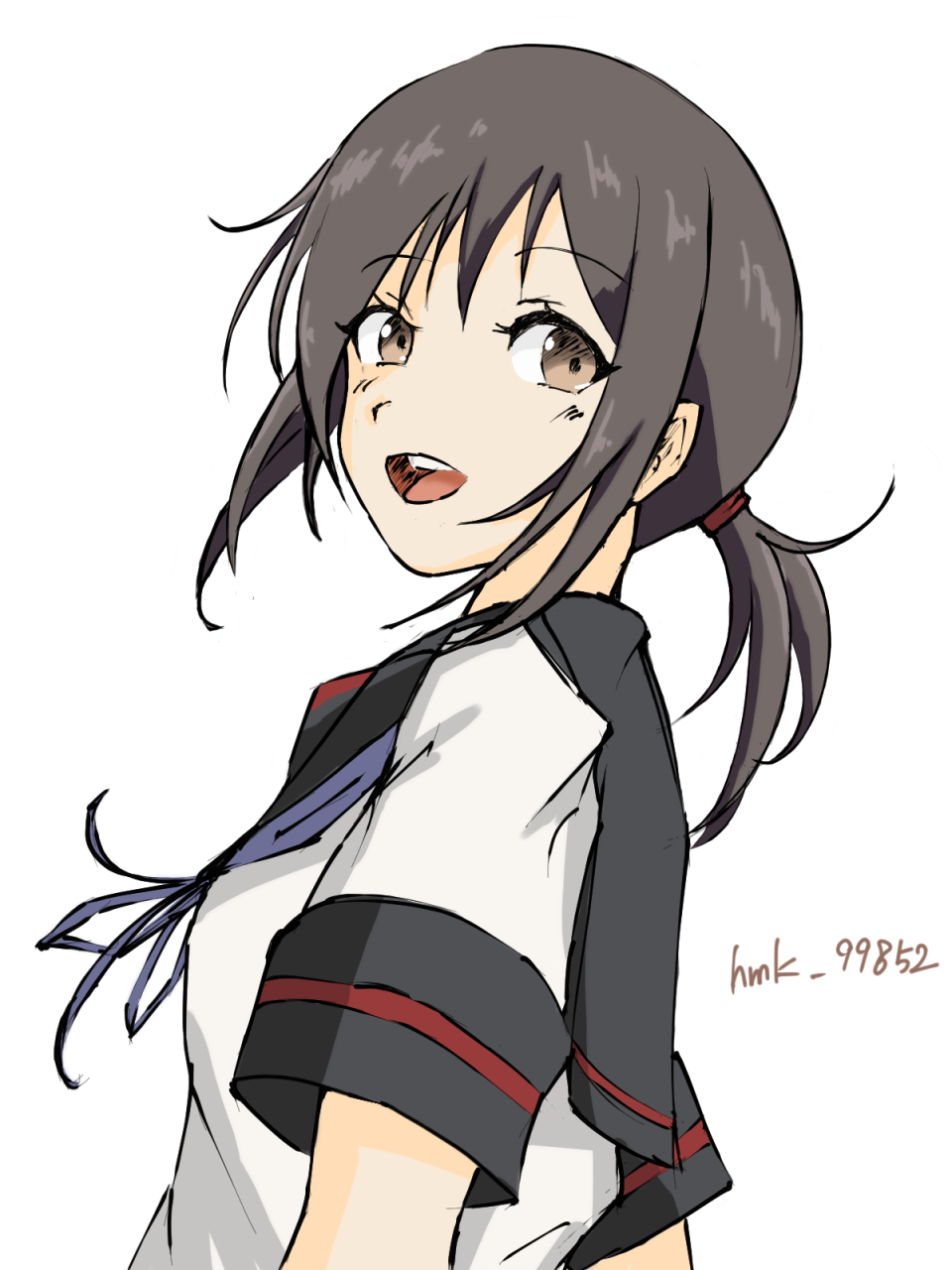 1girl black_hair black_sailor_collar blue_neckerchief brown_eyes chuchu_tako fubuki_(kancolle) fubuki_kai_ni_(kancolle) highres kantai_collection low_ponytail neckerchief one-hour_drawing_challenge open_mouth ponytail sailor_collar sailor_shirt school_uniform serafuku shirt simple_background smile solo teeth twitter_username upper_teeth_only white_background white_shirt
