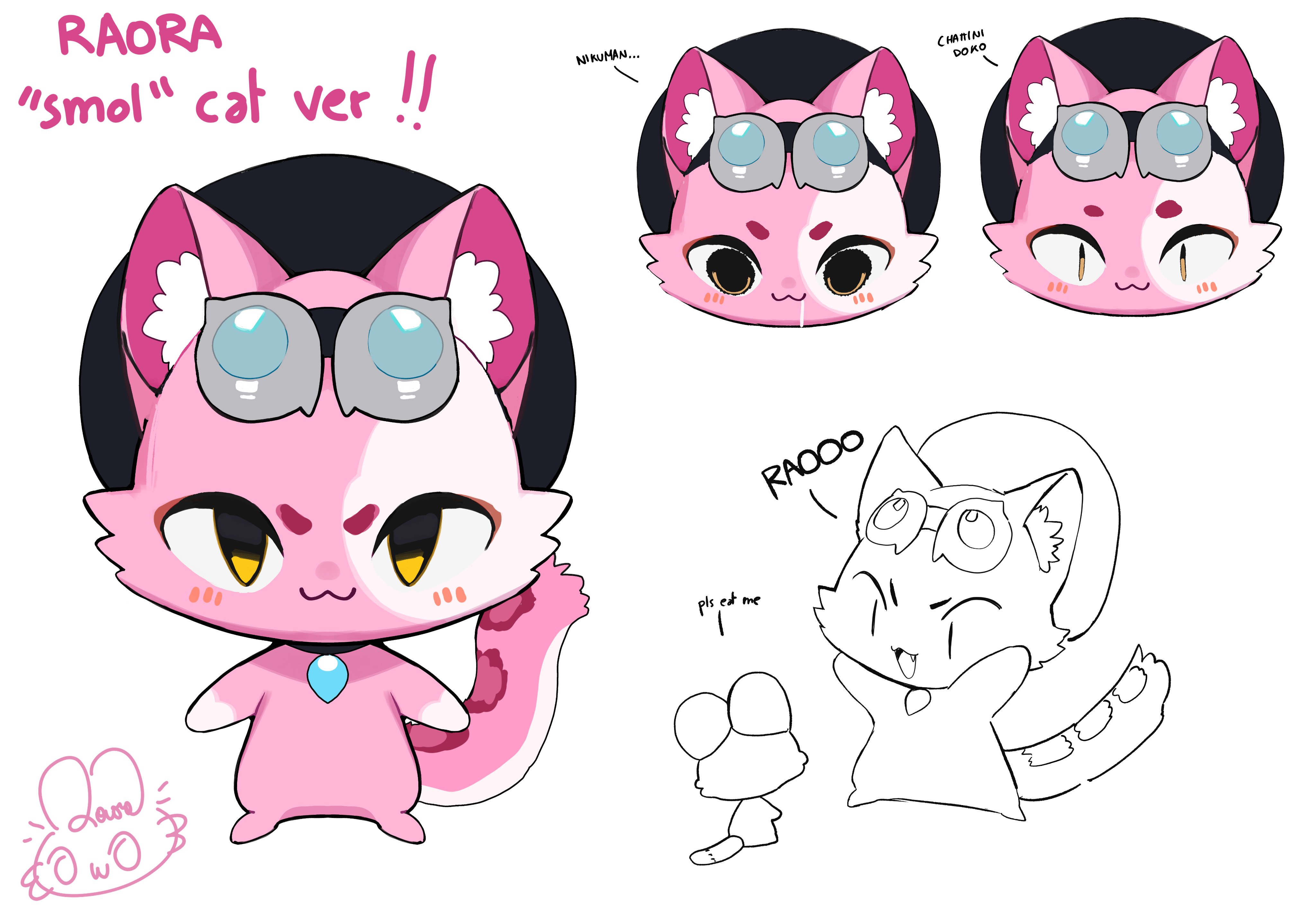 absurdres animal_ear_fluff animal_ears animalization beret black_hat blush cat cat_ears cat_tail chattino_(raora_panthera) chibi chibi_only chibikemo creature creature_focus full_body furry furry_female goggles goggles_on_head hat highres hololive hololive_english looking_at_viewer multiple_expressions pink_hair raora_panthera raora_panthera_(artist) saliva simple_background tail thick_eyebrows virtual_youtuber white_streaks yellow_eyes