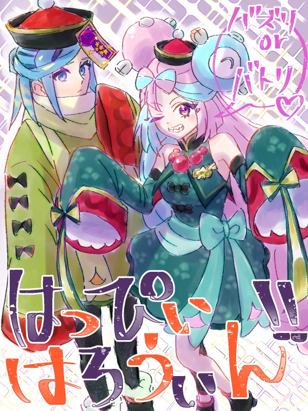 1boy 1girl alternate_costume black_hat blue_eyes blue_hair bow bow-shaped_hair detached_sleeves dress dress_bow green_bow green_dress green_sleeves grusha_(pokemon) hair_ornament hat iono_(fall_2024)_(pokemon) iono_(pokemon) jiangshi long_hair looking_at_viewer multicolored_hair nintendo official_alternate_costume ofuda ofuda_on_head one_eye_closed pantyhose pink_hair pink_pantyhose pokemon pokemon_(creature) pokemon_masters_ex pokemon_scarlet_and_violet qingdai_guanmao red_hat sariika_(sakisariika) sleeveless sleeveless_dress sleeves_past_fingers sleeves_past_wrists translation_request trap two-tone_hair two-tone_hat