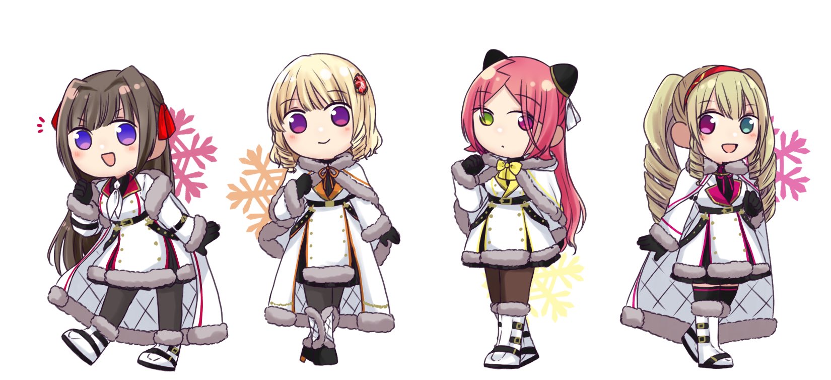 4girls :d adapted_costume aqua_eyes arm_at_side arm_belt assault_lily belt belt_buckle black_belt black_gloves black_shirt black_skirt black_thighhighs blush boots bow bowtie brown_hair brown_pantyhose buckle buttons cape capelet chibi closed_mouth collared_shirt commentary crossed_legs drill_hair drill_sidelocks full_body fur-trimmed_boots fur-trimmed_cape fur-trimmed_capelet fur-trimmed_jacket fur-trimmed_sleeves fur_trim gem gem_hair_ornament gloves green_eyes hair_intakes hair_ribbon hairband hairpods hand_up heel_up heterochromia high-waist_belt highres imamura_yukari_(assault_lily) jacket komai_sumire kozue_west long_hair long_sleeves looking_at_viewer miniskirt multiple_girls neck_ribbon neckerchief nigari_(ngari_0115) notice_lines open_mouth orange_ribbon pantyhose parted_bangs pink_eyes pink_ribbon purple_eyes red_eyes red_gem red_hair red_hairband red_ribbon ribbon shiba_tomoshibi shirt short_hair sidelocks simple_background skirt smile snowflake_background standing untranslatable_commentary thighhighs twintails watson_cross white_background white_cape white_capelet white_footwear white_jacket white_neckerchief winter_clothes yellow_bow yellow_bowtie