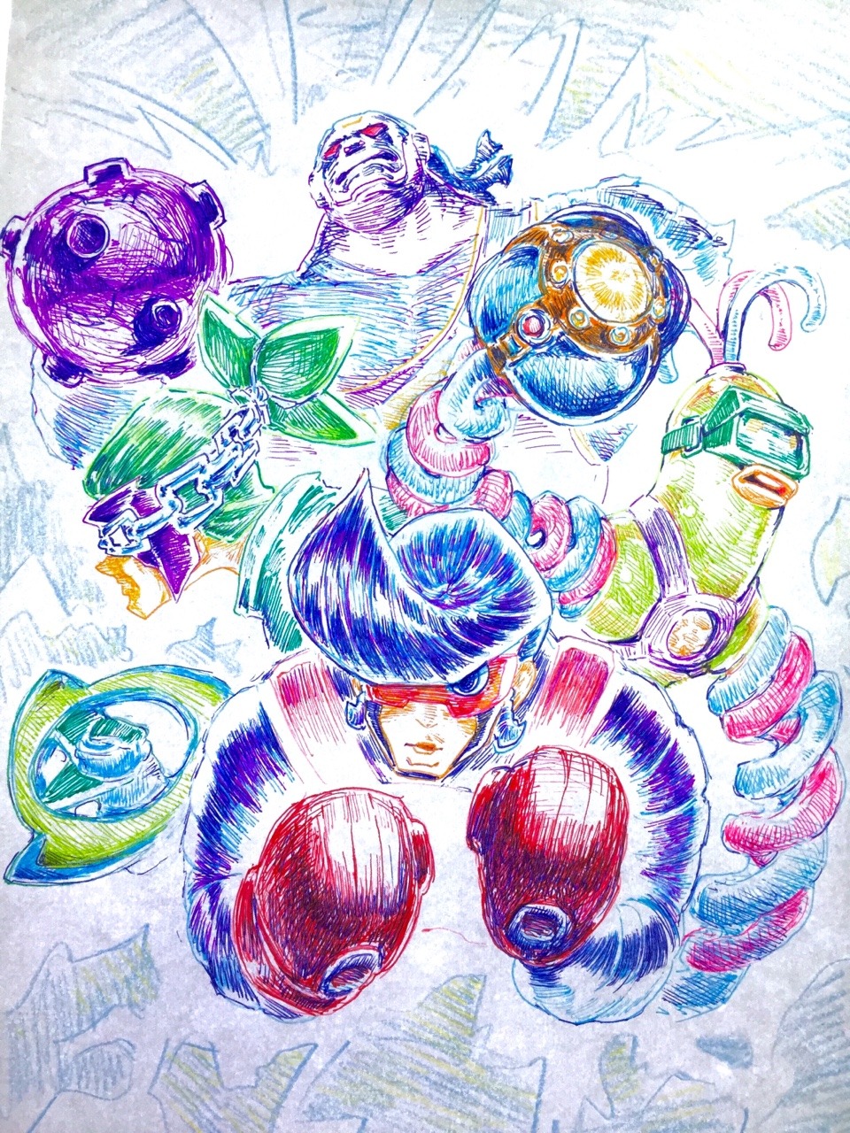 4boys arms_(game) bellaraika blue_eyes boxing_gloves chain dna_man_(arms) fighting_stance goggles green_hair highres mask master_mummy_(arms) multiple_boys mummy ninjara_(arms) nintendo pompadour ponytail red_eyes spring_man_(arms) upper_body