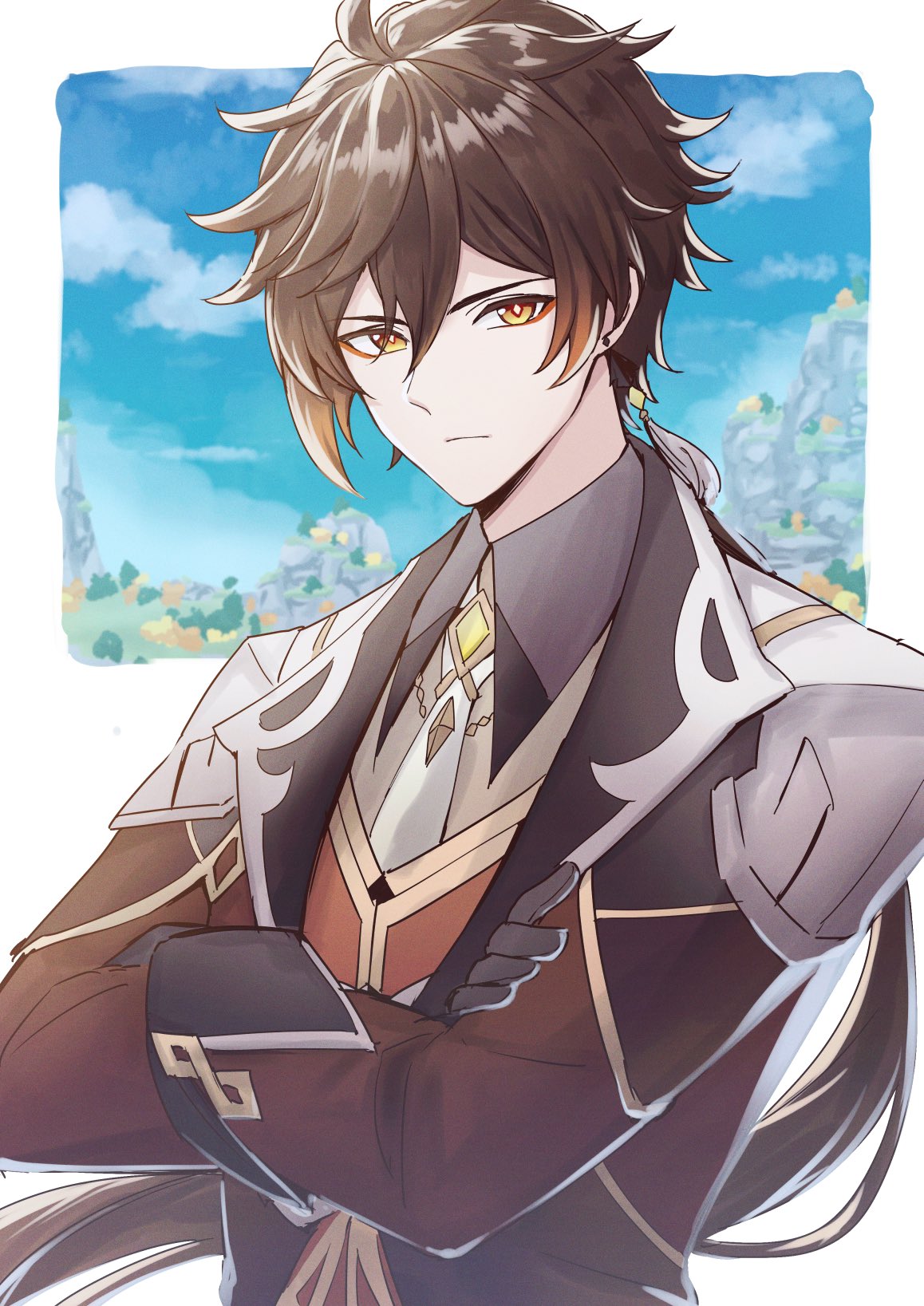 1boy blue_gloves blue_sky brown_eyes brown_hair chinese_commentary closed_mouth cloud collared_shirt commentary_request crossed_arms frown gem genshin_impact gloves hair_between_eyes highres long_sleeves looking_at_viewer male_focus ponytail shirt sky solo su-gu-ru upper_body vest wing_collar yellow_gem zhongli_(genshin_impact)