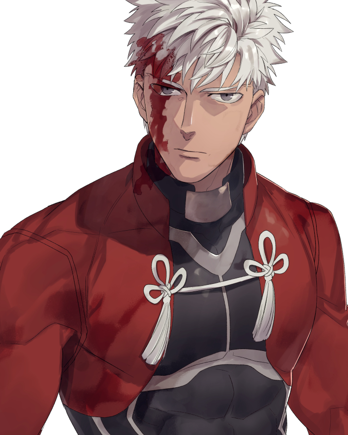 1boy archer_(fate) blood blood_in_hair blood_on_face commentary_request covered_abs dark-skinned_male dark_skin fate/stay_night fate_(series) grey_eyes ichimatsuinfo jacket male_focus muscular muscular_male pectorals red_jacket serious solo upper_body white_hair