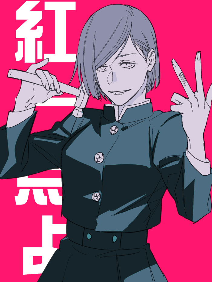 1girl commentary_request greyscale_with_colored_background hammer holding holding_hammer ichimatsuinfo jacket jujutsu_kaisen jujutsu_tech_uniform kugisaki_nobara pleated_skirt red_background school_uniform short_hair skirt smile solo swept_bangs upper_body
