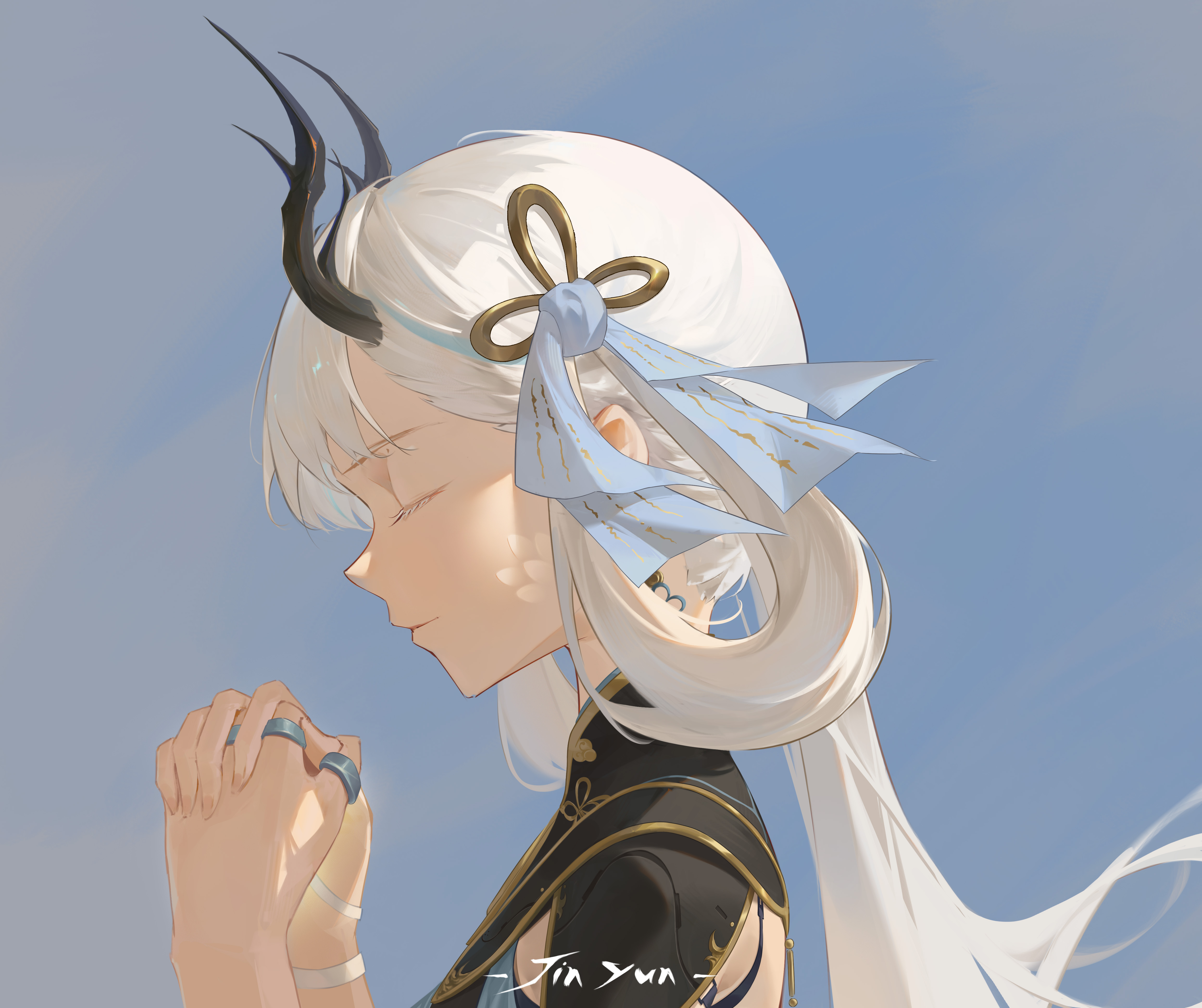 1girl absurdres blue_background blue_ribbon chinese_commentary closed_eyes colored_eyelashes commentary dragon_horns earrings expressionless from_side hair_ribbon hair_rings highres horns jewelry jin_yun_g jinhsi_(wuthering_waves) own_hands_clasped own_hands_together portrait praying profile ribbon ring scales signature simple_background solo thumb_ring twintails white_eyelashes white_hair white_scales wuthering_waves