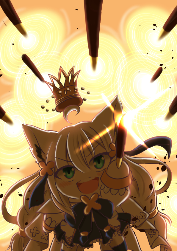1girl ahoge animal_ear_fluff animal_ears ascot blue_ascot blue_skirt blush braid chibi commentary_request earrings fox_ears fox_girl gate_of_babylon_(fate) green_eyes hair_between_eyes hololive jewelry long_hair looking_at_viewer open_mouth outstretched_arm pocky_day shirakami_fubuki shirakami_fubuki_(saint) shirt sidelocks single_braid skirt solo twin_braids user_gpjs3474 virtual_youtuber white_hair white_shirt