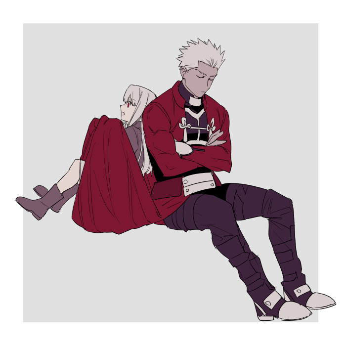 1boy 1girl archer_(fate) back-to-back boots brown_footwear closed_eyes commentary_request dark-skinned_male dark_skin fate/stay_night fate_(series) ichimatsuinfo illyasviel_von_einzbern invisible_chair jacket pants pants_under_skirt red_eyes red_jacket red_skirt sitting skirt white_hair
