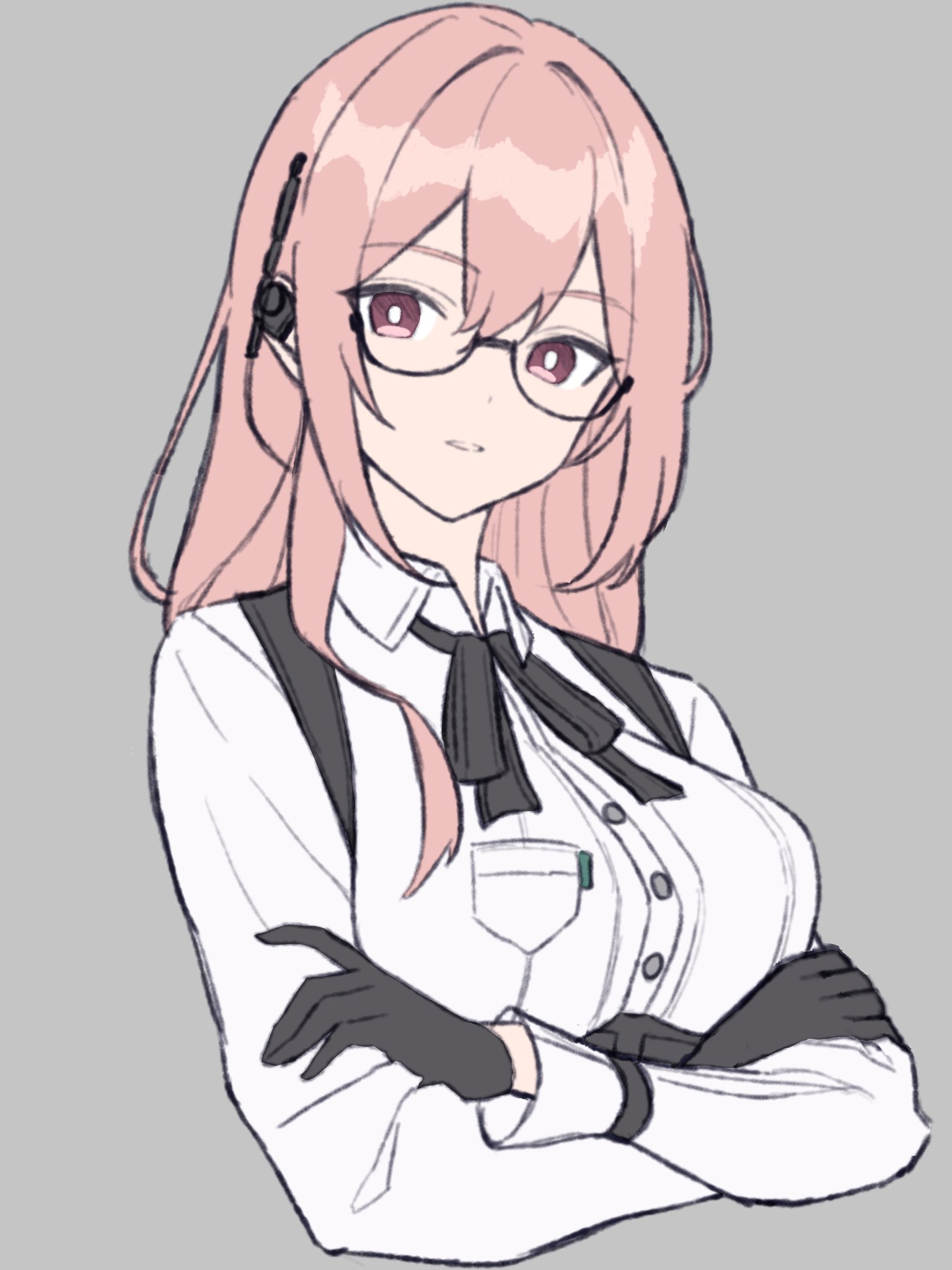 1girl black-framed_eyewear black_ribbon breasts collared_shirt cropped_torso crossed_arms dwun_pubg earpiece glasses gloves grey_background hair_between_eyes highres large_breasts long_hair long_sleeves looking_at_viewer parted_lips pink_eyes pink_hair ribbon shirt simple_background solo tsukishiro_yanagi upper_body white_shirt zenless_zone_zero