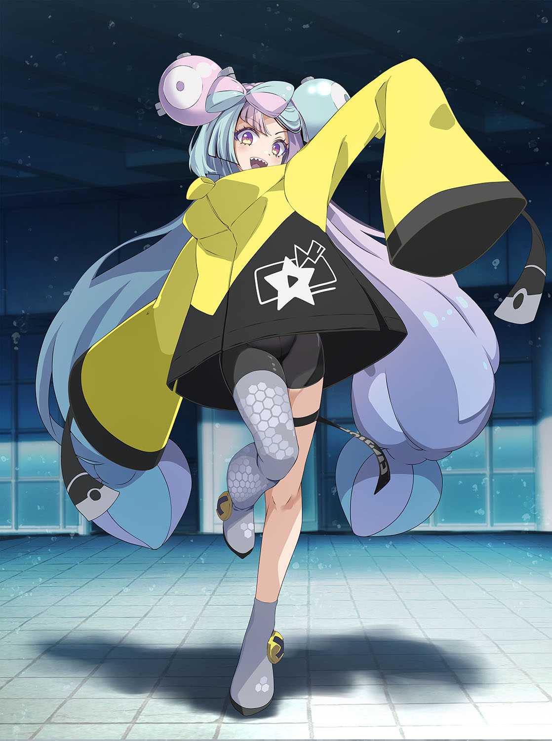 1girl bow-shaped_hair character_hair_ornament full_body grey_pantyhose hair_ornament hexagon_print highres iono_(pokemon) jacket long_hair low-tied_long_hair multicolored_hair nintendo oversized_clothes pantyhose pokemon pokemon_scarlet_and_violet sharp_teeth single_leg_pantyhose sleeves_past_fingers sleeves_past_wrists solo split-color_hair teeth tsukishiro_saika two-tone_hair x_(symbol) yellow_jacket