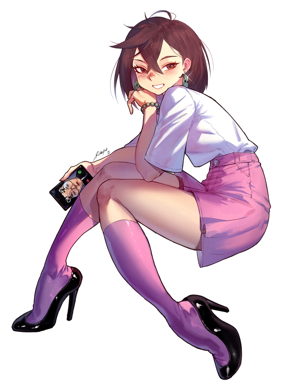1boy 1girl ayase_momo bead_bracelet beads bracelet brown_eyes brown_hair commentary dandadan earrings english_commentary glasses high_heels highres holding holding_phone jewelry pendant_earrings phone rattlepool round_eyewear shirt short_hair signature simple_background takakura_ken_(dandadan) white_background white_shirt