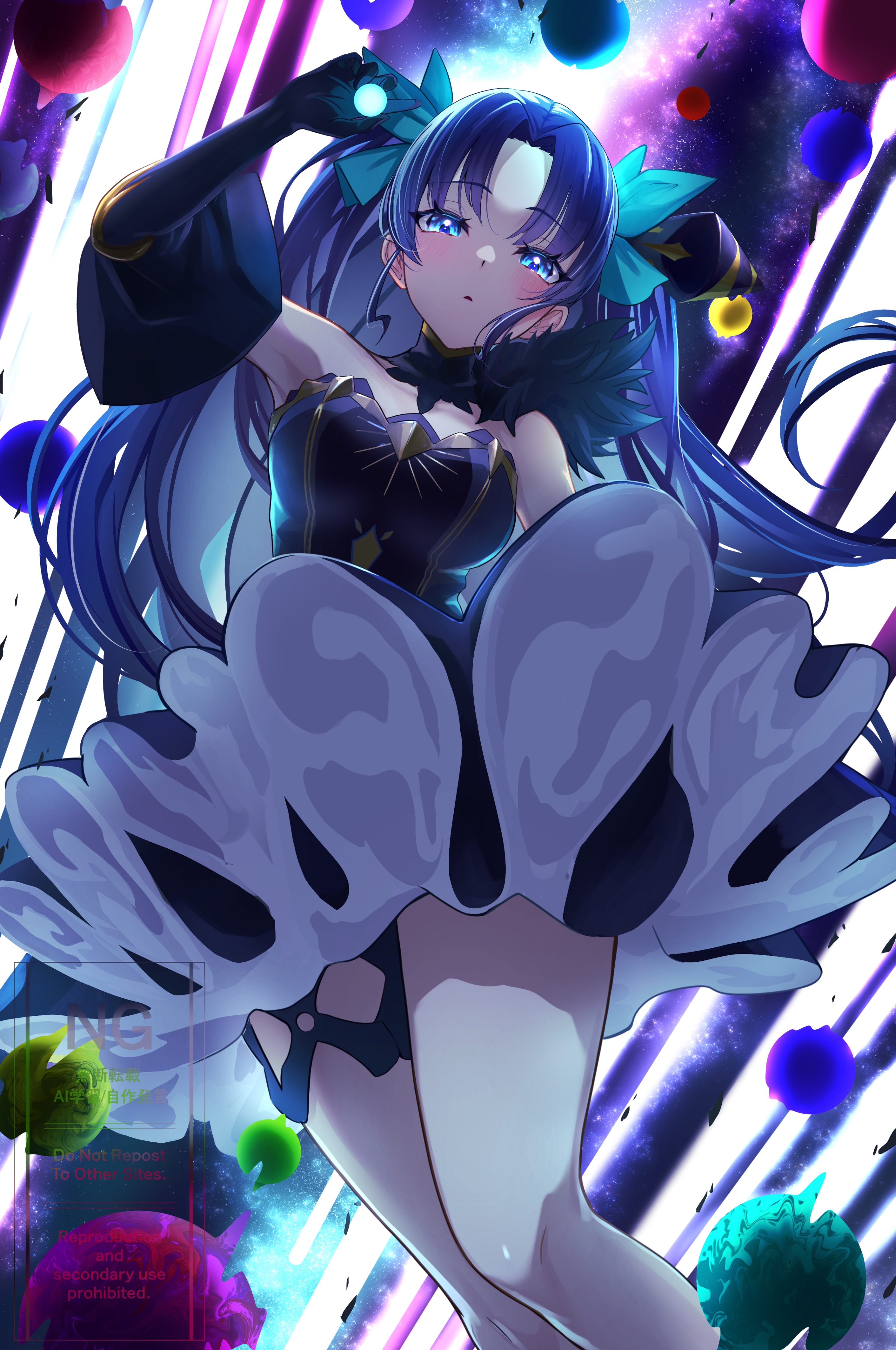 1girl absurdres bare_shoulders blue_eyes blush bow breasts detached_sleeves ereshkigal_(fate) fate/grand_order fate_(series) hair_bow highres horns legs medium_breasts purple_hair purple_skirt shafurakafusha single_horn skirt anki-ereshkigal_(fate) twintails watermark