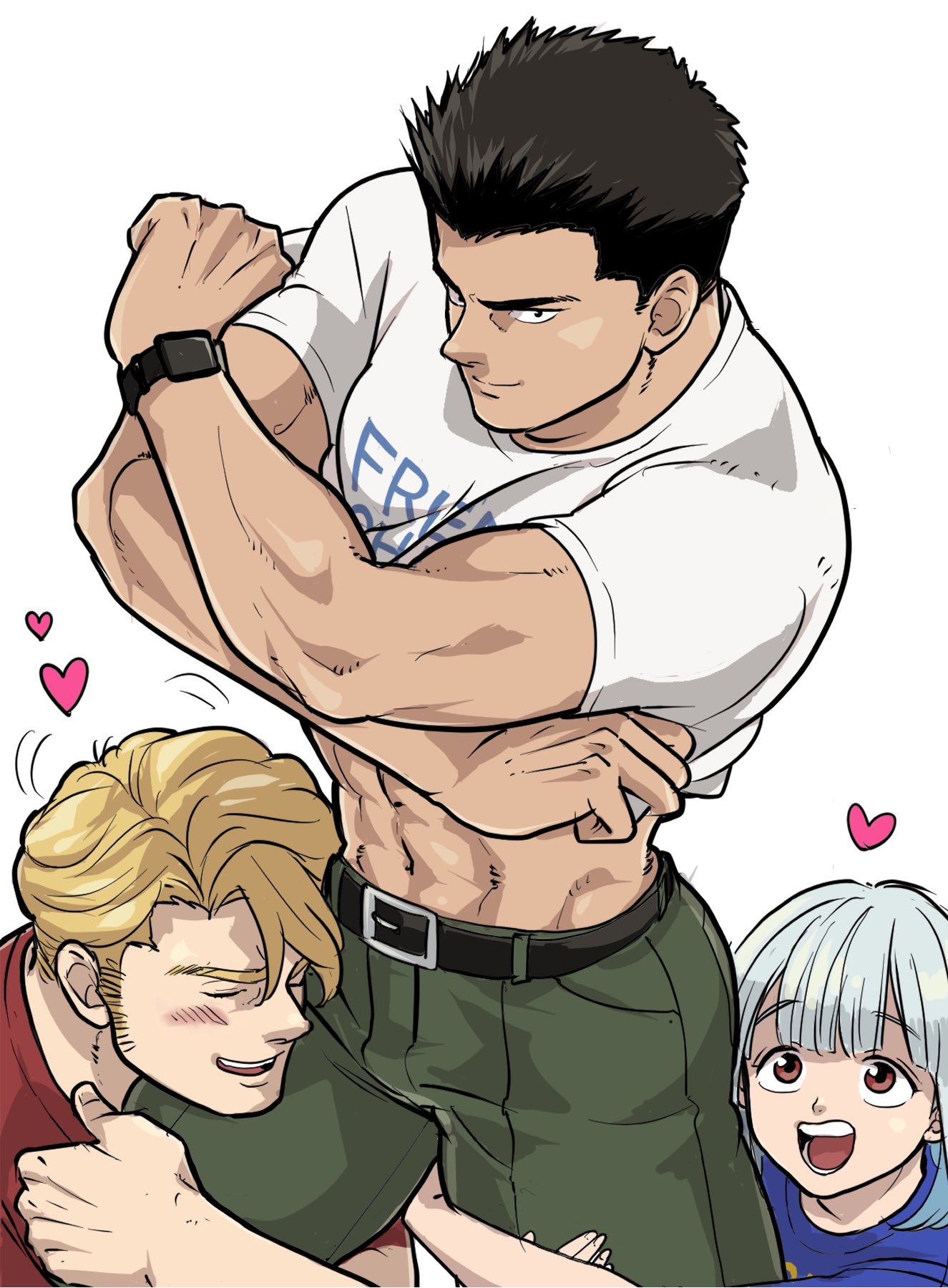 1girl 2boys abs ao_isami aya942841437606 bara belt black_hair blonde_hair blush closed_eyes clothes_lift commentary_request facial_hair green_pants heart highres hugging_another's_leg lewis_smith lifting_own_clothes lulu_(bang_bravern) male_focus multiple_boys muscular muscular_male navel pants shirt shirt_lift short_hair sideburns_stubble simple_background stubble t-shirt white_background yuuki_bakuhatsu_bang_bravern