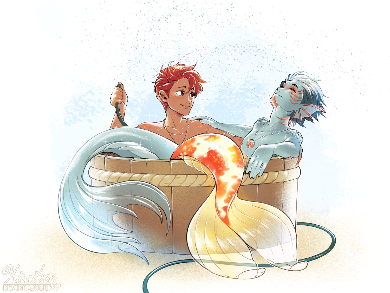 2boys blue_hair closed_eyes colored_skin commentary english_commentary fins grey_skin head_fins holding holding_hose hose jewelry lucas_cosc mermaid merman mica_(strawberry_moon_the_daughter_of_the_moon) miraculous_kiwi monster_boy monster_girl multiple_boys necklace original red_hair scales smile strawberry_moon_the_daughter_of_the_moon tail