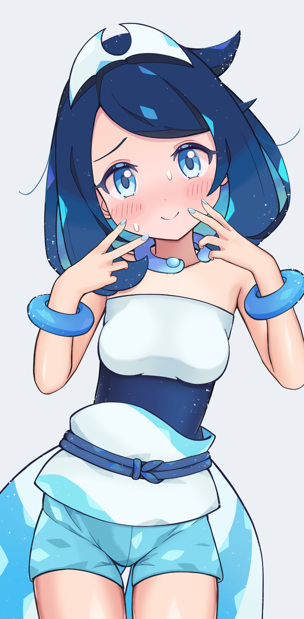 1girl black_hair blue_hair blue_shorts blush closed_mouth colored_inner_hair commentary_request cosplay cowboy_shot double_v hairband highres irida_(pokemon) irida_(pokemon)_(cosplay) liko_(pokemon) looking_at_viewer melili multicolored_hair nintendo official_alternate_color pokemon pokemon_(anime) pokemon_horizons pokemon_masters_ex shirt short_shorts shorts sleeveless sleeveless_shirt smile solo strapless strapless_shirt two-tone_hair v white_hairband