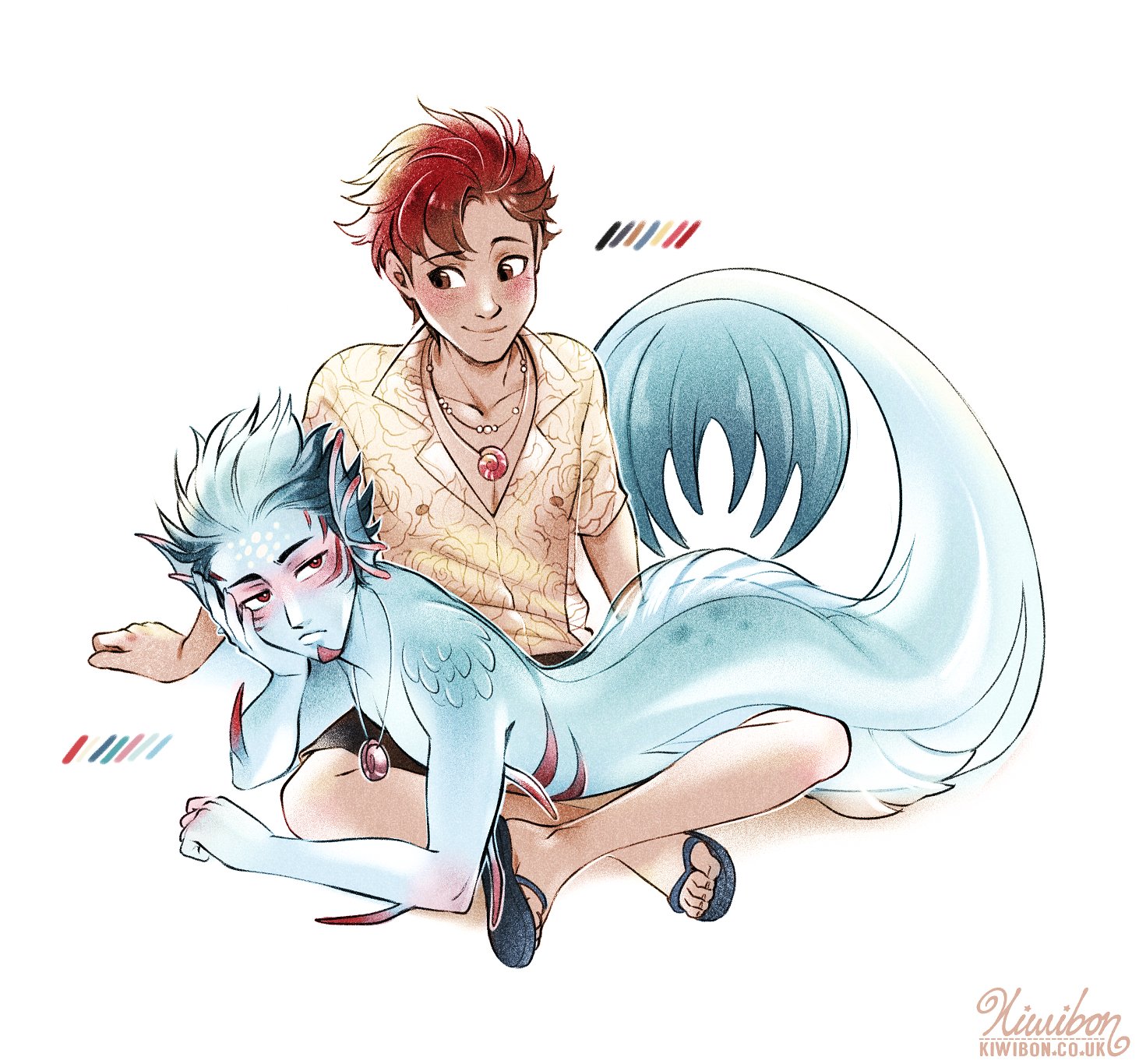 2boys blush colored_skin commentary english_commentary grey_skin highres indian_style jewelry lucas_cosc male_focus mermaid merman mica_(strawberry_moon_the_daughter_of_the_moon) miraculous_kiwi monster_boy monster_girl multiple_boys necklace original scales shirt sitting sitting_on_lap sitting_on_person strawberry_moon_the_daughter_of_the_moon tail white_background