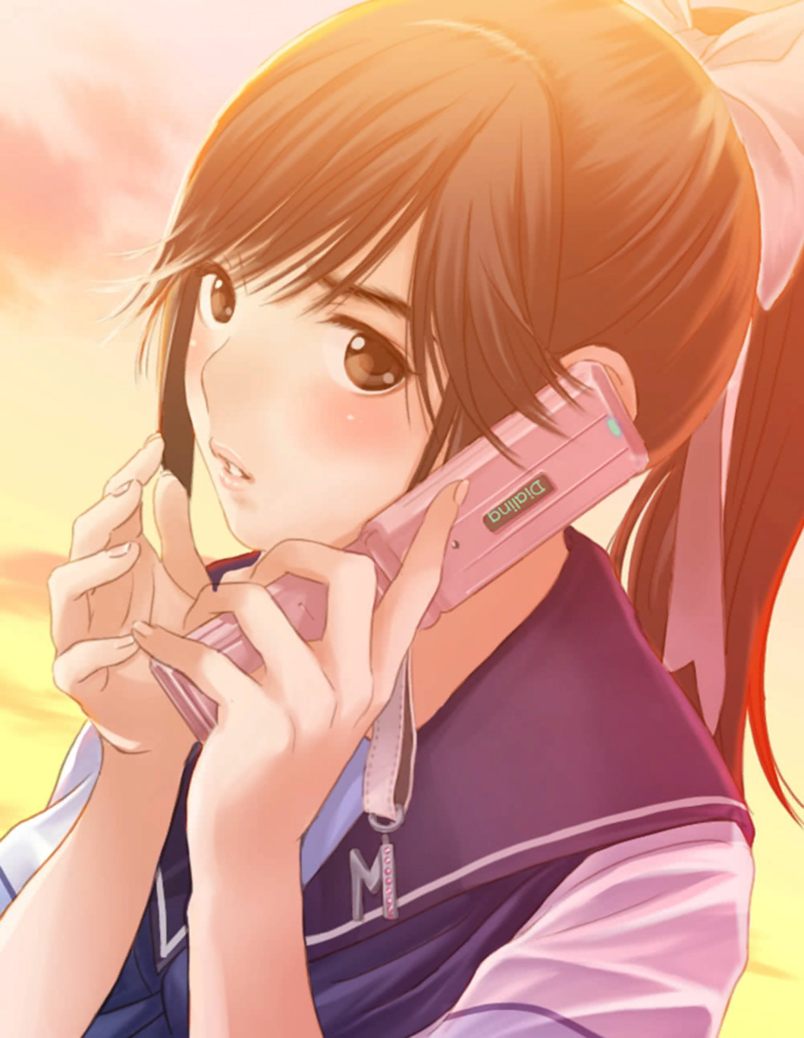 1girl black_eyes black_hair blue_neckerchief blue_sailor_collar blush bow cellphone cellphone_charm charm_(object) cloud commentary_request evening flip_phone gradient_sky hair_bow hair_ribbon hands_up highres holding holding_phone looking_at_viewer love_plus neckerchief official_art open_mouth orange_sky outdoors parted_lips phone pink_lips pink_sky ponytail portrait ribbon sailor_collar school_uniform serafuku short_sleeves sky solo summer_uniform takane_manaka talking_on_phone twilight upper_body white_bow white_ribbon