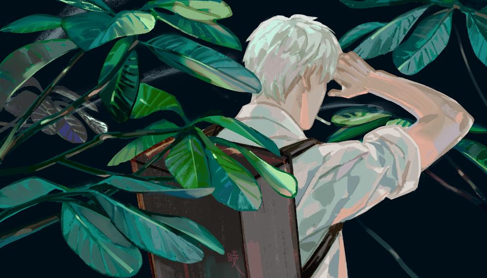 1boy arm_up backpack bag black_background cigarette collared_shirt commentary_request from_behind ginko_(mushishi) leaf male_focus mushishi plant saiga_tokihito shirt short_hair sleeves_rolled_up smoke smoking solo upper_body white_hair white_shirt