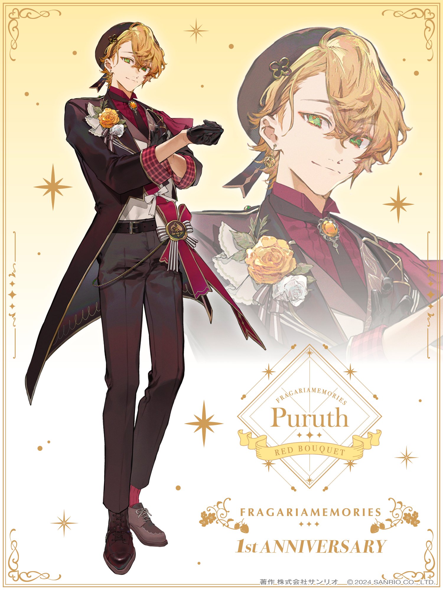 1boy adjusting_clothes adjusting_sleeves alternate_costume anniversary asymmetrical_footwear belt belt_buckle beret black_gloves black_necktie blonde_hair boots boutonniere brooch brown_belt brown_coat brown_footwear brown_hat brown_pants buckle character_name closed_mouth clover_hat_ornament coat copyright_name copyright_notice earrings flower fragaria_memories full_body gem gloves gradient_background green_eyes hair_behind_ear hair_between_eyes half_gloves hat hat_ornament highres jewelry lace-up_boots long_sleeves looking_at_viewer male_focus necktie nozaki_tsubata official_art open_clothes open_coat pants plaid_clothes puruth_(fragaria_memories) red_sash red_shirt red_socks rose sash shirt shoes short_hair shoulder_sash sleeve_cuffs smile socks solo standing star_(symbol) tuxedo_shirt vest white_background white_vest yellow_background yellow_flower yellow_gem yellow_rose zoom_layer