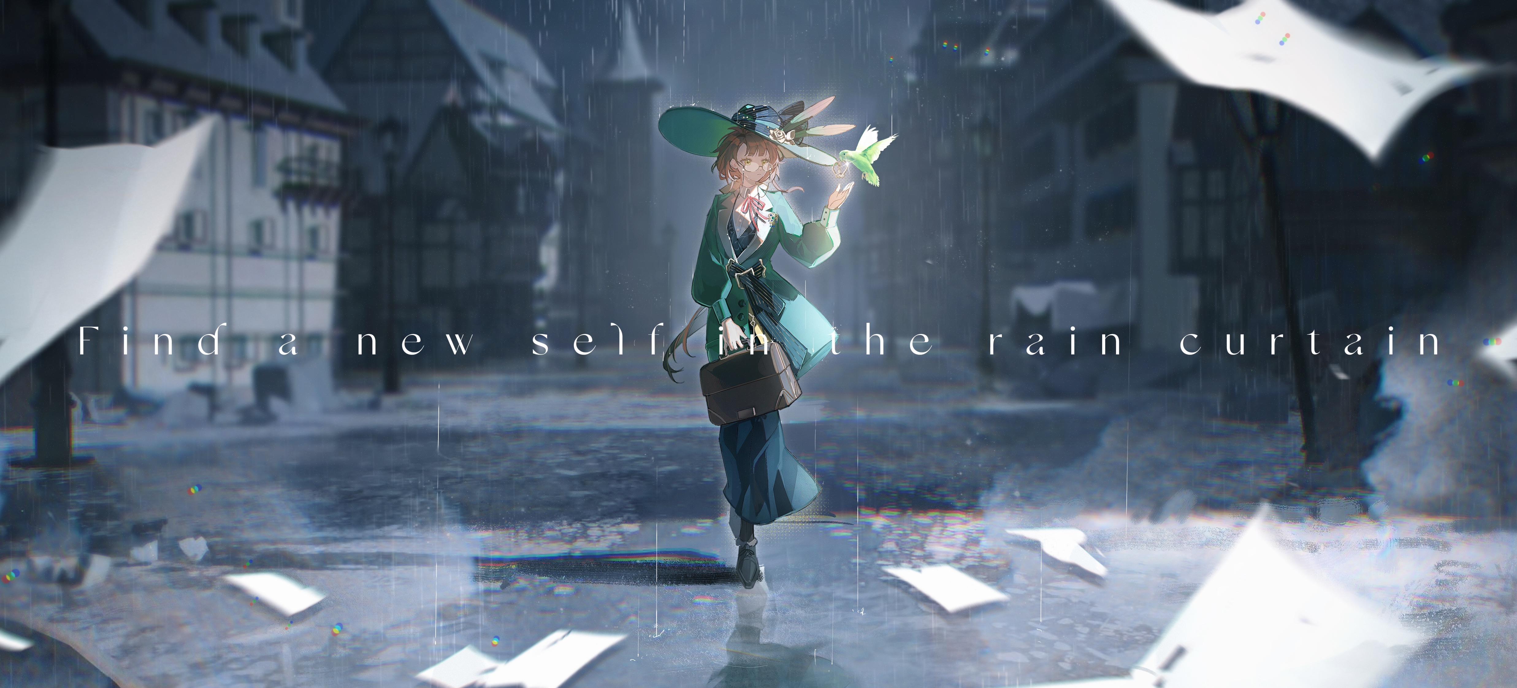 1girl absurdres bag bird black_footwear black_skirt bloom brown_bag brown_hair building collared_shirt english_text european_architecture eyewear_strap feathers flower flying_paper full_body glasses green_bird green_eyes green_feathers green_hat green_jacket hand_up hat hat_feather hat_flower highres hofmann_knot holding holding_bag jacket kakania_(reverse:1999) long_hair long_skirt long_sleeves looking_at_animal looking_to_the_side low_ponytail neck_ribbon outdoors paper picture_hat ponytail puffy_long_sleeves puffy_sleeves rain red_ribbon reverse:1999 ribbon road round_eyewear shirt skirt solo street very_long_hair walking white_shirt wide_shot yellow_flower zhuxu