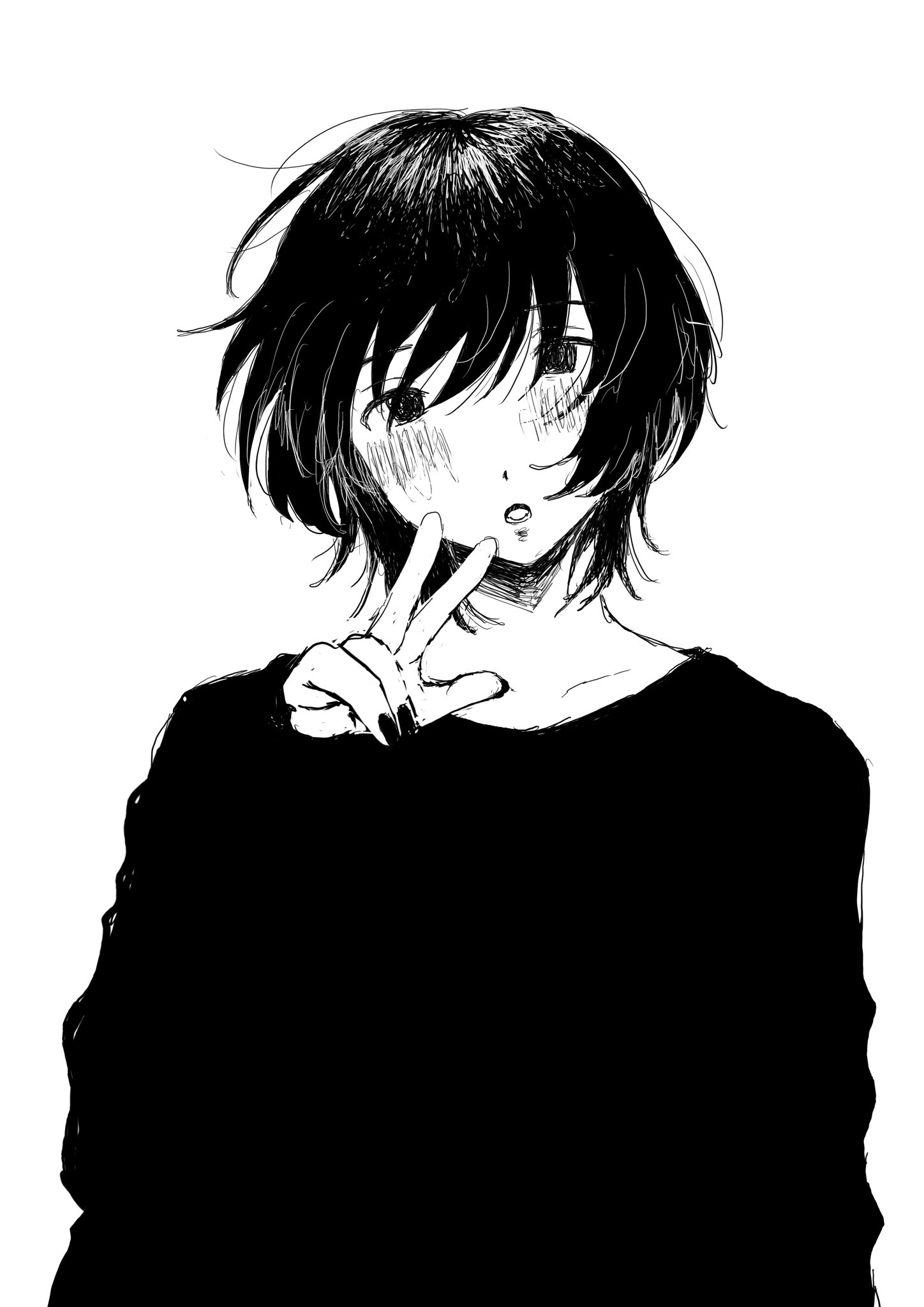 1girl androgynous black_hair blush greyscale hand_up head_tilt highres looking_at_viewer monochrome nail_polish open_mouth original popocna short_hair solo upper_body w
