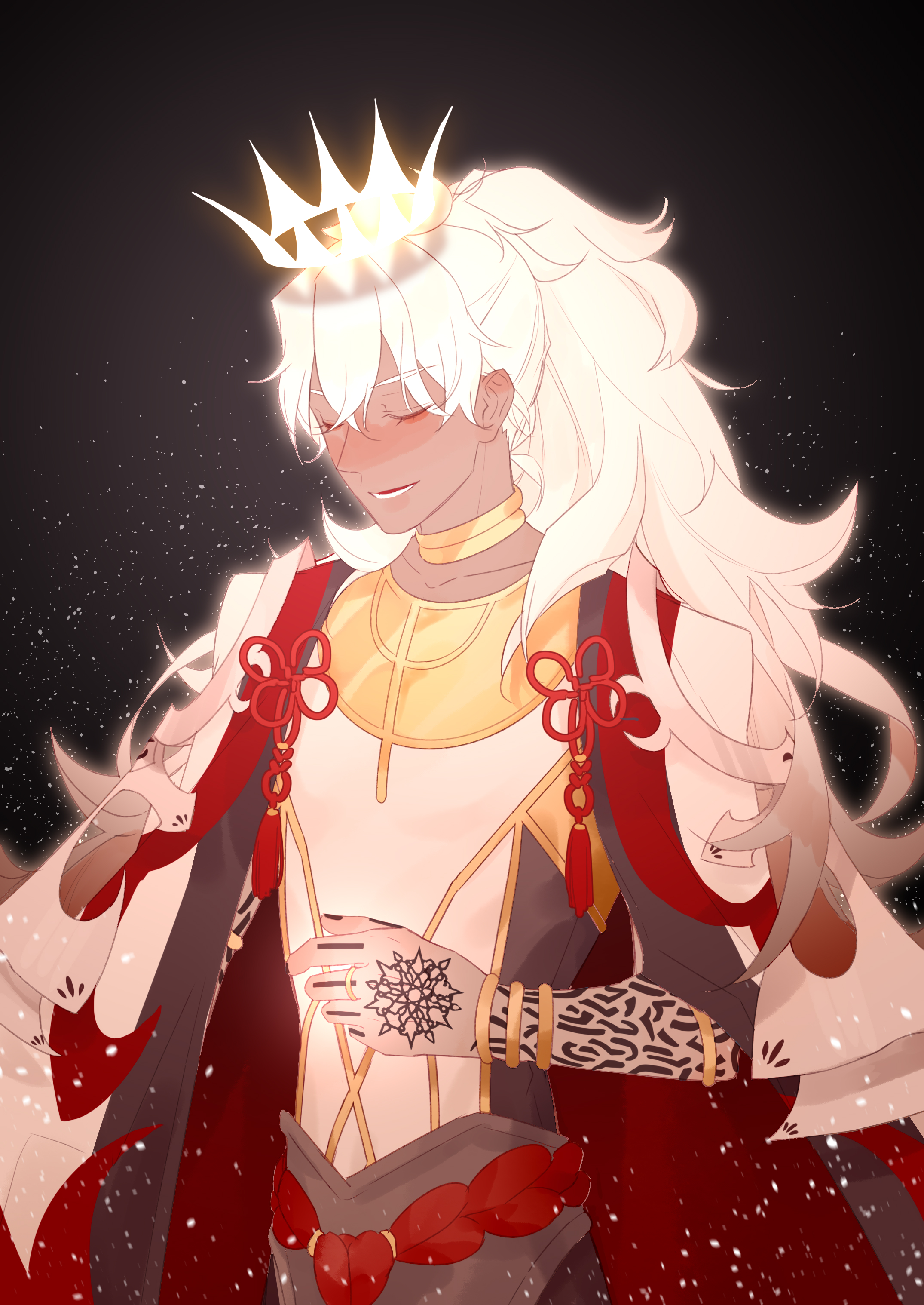 1boy absurdres arm_tattoo black_background black_cape black_shirt bracelet cape closed_eyes commentary cowboy_shot crown dark-skinned_male dark_skin facing_down fate/grand_order fate_(series) floating_crown glowing gold_bracelet gold_ring gold_trim hair_between_eyes hand_tattoo highres jewelry long_hair lower_teeth_only male_focus multicolored_cape multicolored_shirt neck_ring parted_lips ponytail red_cape shirt smile solo solomon_(fate) tassel tattoo teeth torijo white_cape white_hair white_shirt