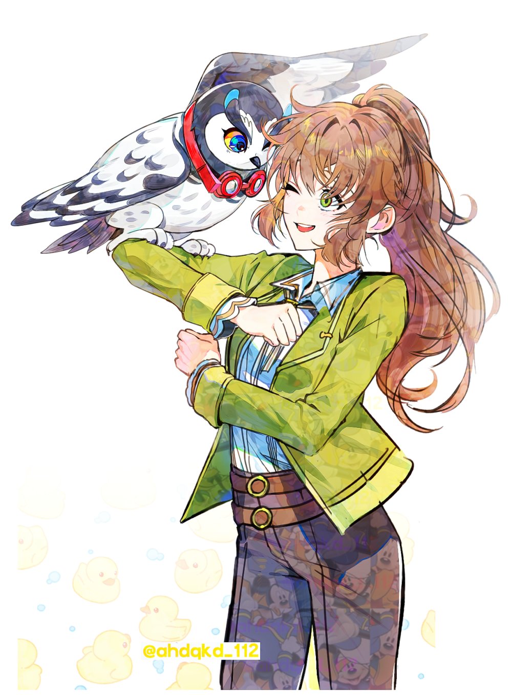 1girl 1other ahdqkd_112 animal animal_on_arm antenna_hair bird bird_on_arm bolo_tie brown_hair denim eiyuu_densetsu goggles goggles_around_neck green_eyes hair_between_eyes highres jacket jeans kai_no_kiseki kuro_no_kiseki_(series) long_hair looking_at_viewer lufel_(owl)_(p5x) lufel_(p5x) one_eye_closed owl pants ponytail sidelocks simple_background smile solo towa_herschel twitter_username voice_actor_connection wavy_hair white_background