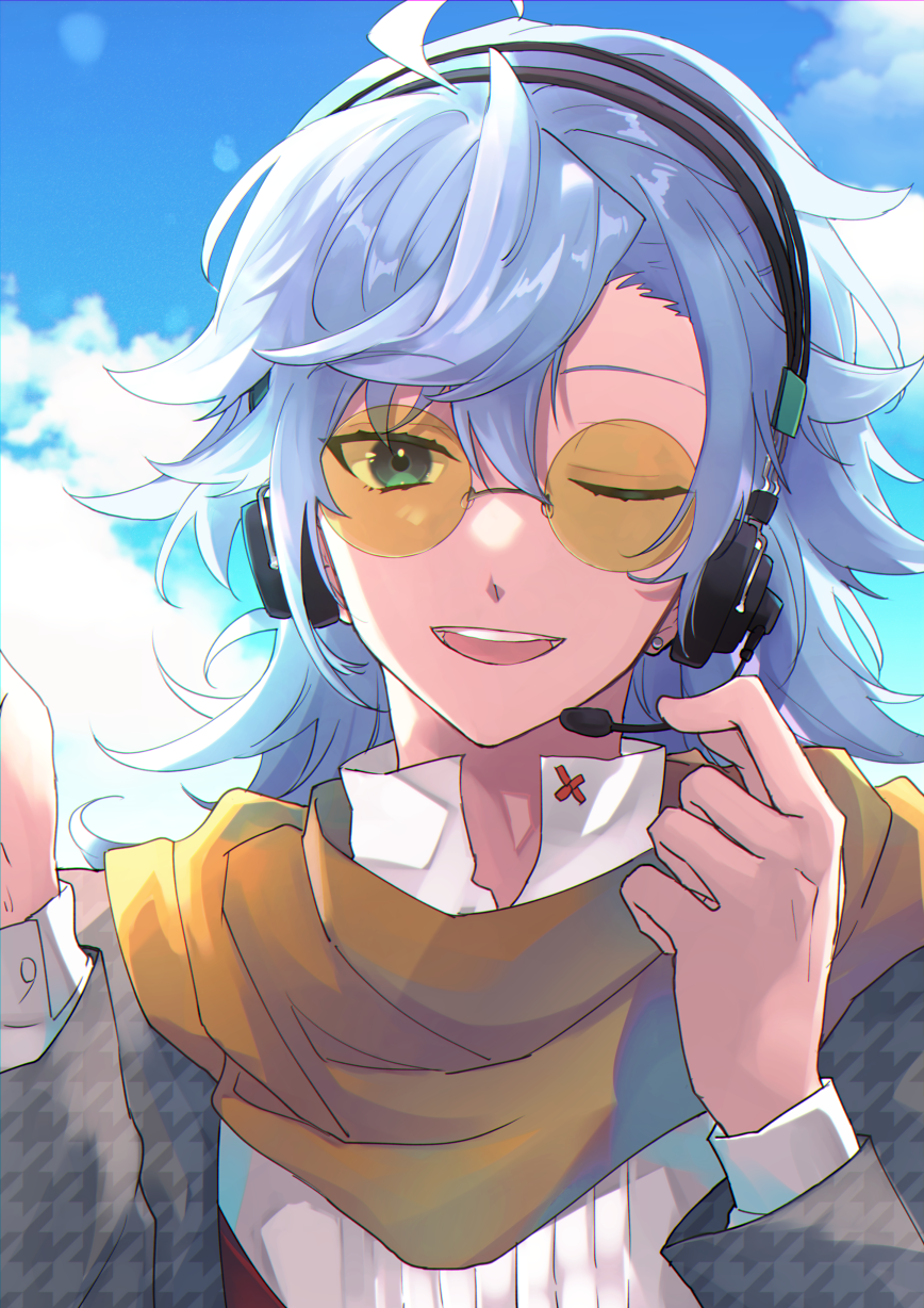 1boy ;d ahoge amachi_(yuuin) blue_eyes blue_sky chromatic_aberration cloud cloudy_sky earrings fate/grand_order fate_(series) grey_hair grey_jacket hair_between_eyes hands_up headset highres houndstooth jacket jewelry long_hair long_sleeves looking_at_viewer male_focus merlin_(commentator_of_flowers)_(fate) merlin_(fate) one_eye_closed open_mouth print_jacket round_eyewear scarf shirt sky smile solo sunglasses tinted_eyewear upper_body white_shirt yellow-tinted_eyewear yellow_scarf
