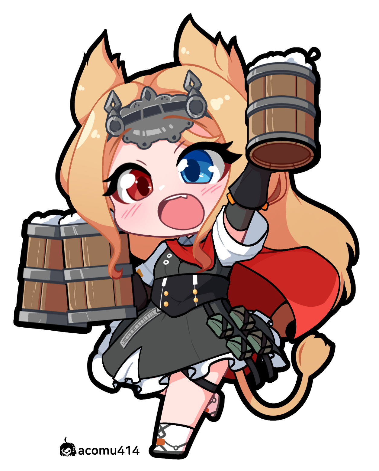 1girl acomu414 archetto_(arknights) arknights arm_up artist_name beer_mug black_gloves blonde_hair blue_eyes blush cape chibi cup dress fang foam full_body gloves grey_dress heterochromia highres holding long_hair mug open_mouth red_cape red_eyes shirt short_sleeves simple_background solo very_long_hair walking white_background white_footwear white_shirt