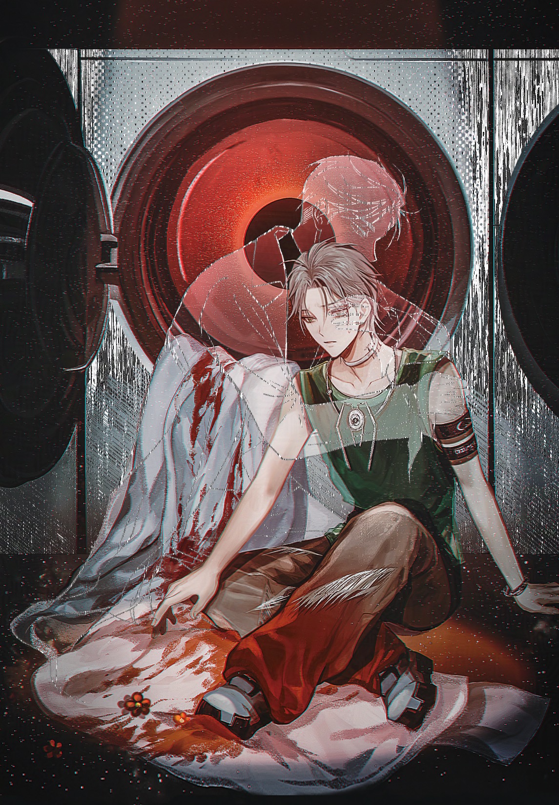 2boys alien_stage armband blood blood_on_clothes choker coat commentary flower ghost green_tank_top grey_hair grey_pants hand_rest highres hug ivan_(alien_stage) jingjue_de_yumiao male_focus multiple_boys neck_tattoo pants red_flower red_pants short_hair sitting tank_top tattoo till_(alien_stage) two-tone_pants unworn_coat very_short_hair washing_machine white_coat