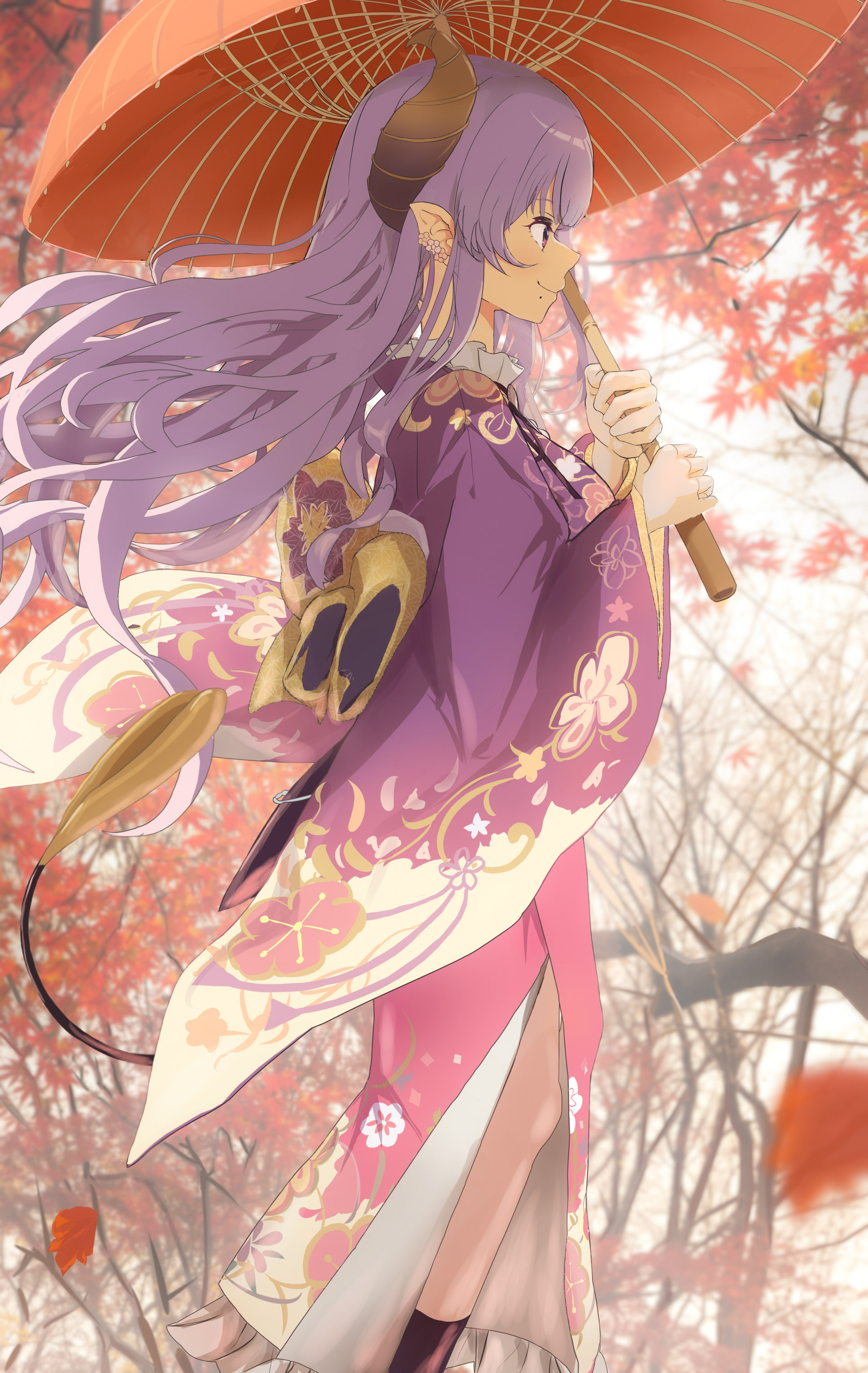 1girl absurdres autumn_leaves botan_(oacdrykafjf3g3d) bow brown_horns closed_mouth commentary_request demon_girl demon_horns demon_tail feet_out_of_frame floral_print floral_print_kimono highres holding holding_umbrella horns japanese_clothes kimono leaf long_hair looking_afar maple_leaf mole mole_under_mouth nanashi_inc. oil-paper_umbrella orange_umbrella pointy_ears print_kimono profile purple_eyes purple_hair purple_kimono saionji_mary saionji_mary_(9th_costume) solo standing tail tree umbrella very_long_hair virtual_youtuber wind yellow_bow
