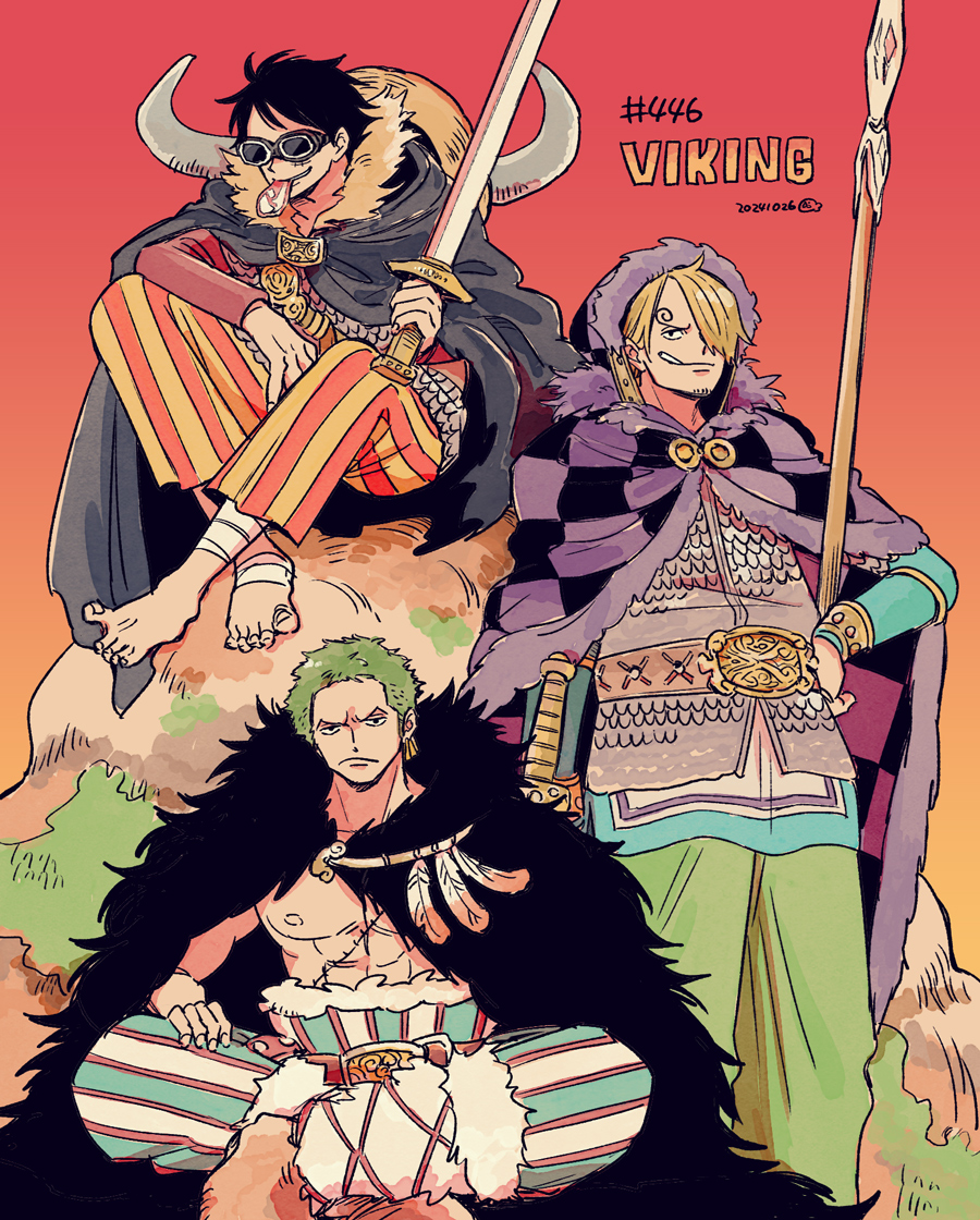 3boys abs black_hair blonde_hair cape cigarette cloak closed_mouth commentary_request curly_eyebrows dated earrings facial_hair food fur_cape goatee goggles gradient_background green_hair green_pants hat hatch_(8cco) holding holding_sword holding_weapon hood hooded_cloak jewelry looking_at_viewer male_focus monkey_d._luffy multiple_boys one_piece pants roronoa_zoro sanji_(one_piece) sitting smile stitched_torso stitches straw_hat striped_clothes striped_pants sword vertical-striped_clothes vertical-striped_pants weapon