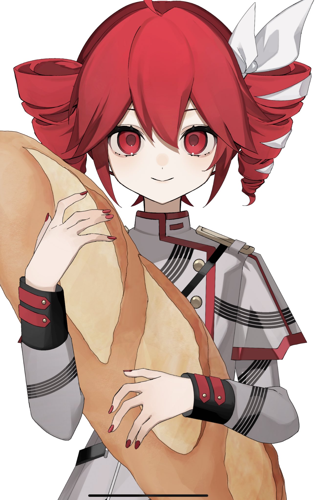 1girl ahoge baguette belt blush bow bread buttons double-parted_bangs drill_hair enka_(nacl_chica) fingernails food hair_between_eyes hair_bow hair_ribbon highres holding holding_food jacket kasane_teto kasane_teto_(sv) looking_at_viewer musical_staff nail_polish red_eyes red_hair red_nails red_trim ribbon shoulder_belt shoulder_boards simple_background sleeve_cuffs smile solo standing straight-on striped_clothes striped_jacket three-quarter_sleeves twin_drills upper_body utau white_background white_bow white_ribbon