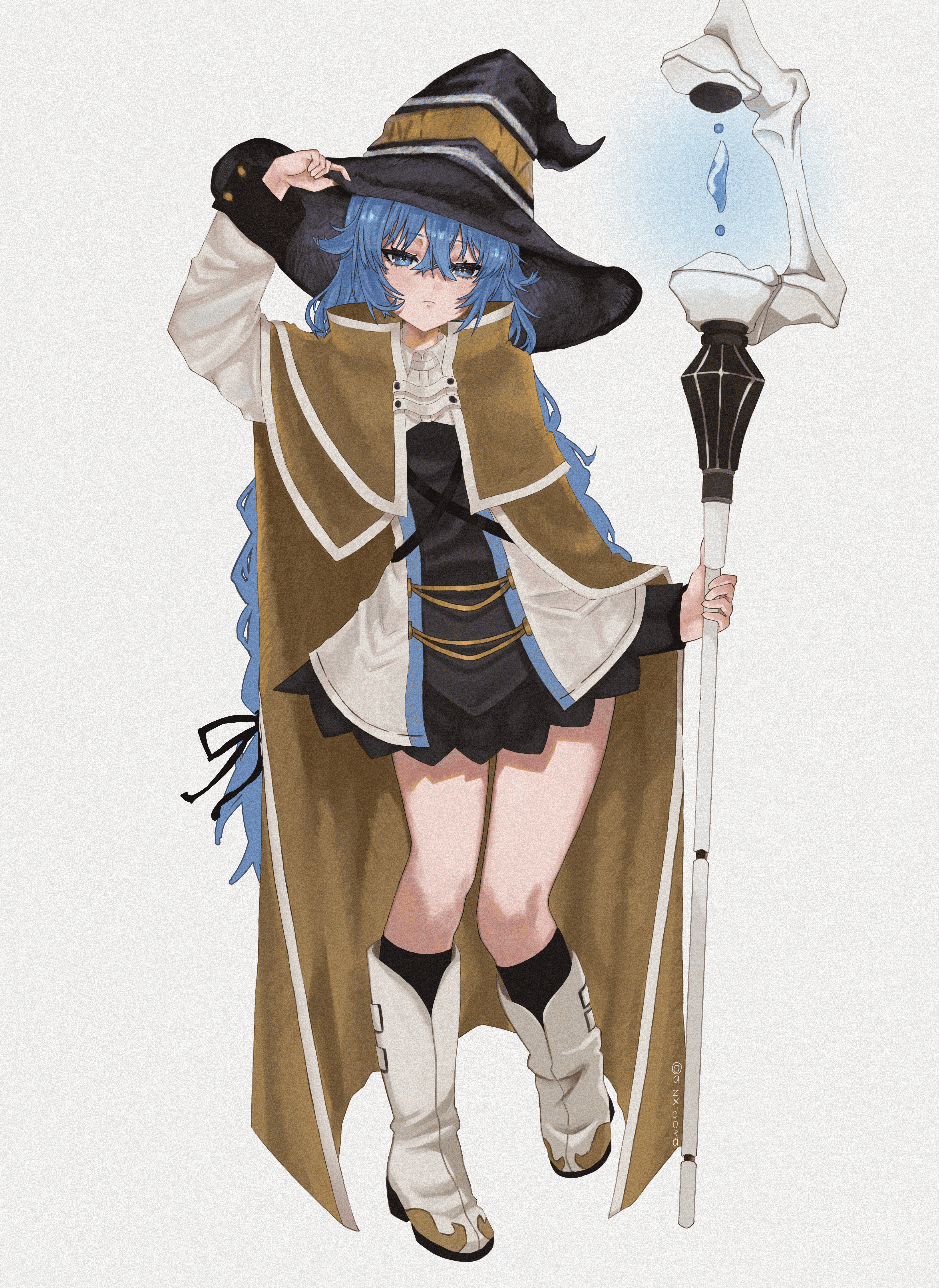 1girl absurdres black_hat black_skirt black_socks blue_eyes blue_hair boots capelet closed_mouth eyebrows_hidden_by_hair flat_chest full_body grey_shirt hair_between_eyes hand_on_headwear hat high_heel_boots high_heels highres holding holding_staff jacket large_hat long_hair looking_at_viewer mushoku_tensei qzxdoraa roxy_migurdia shirt simple_background skirt socks solo staff standing standing_on_one_leg twintails very_long_hair white_background white_boots white_capelet white_jacket witch_hat