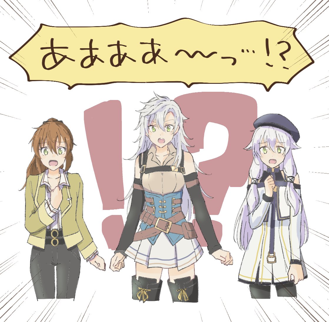 !? 3girls altina_orion appleajyuxxxx belt beret black_hair black_pants brown_hair cropped_legs eiyuu_densetsu emphasis_lines fie_claussell green_eyes hair_between_eyes hat high-waist_pants kai_no_kiseki kuro_no_kiseki_(series) long_hair looking_at_viewer multiple_girls open_mouth pants parted_bangs pleated_skirt simple_background skirt standing towa_herschel translation_request white_background white_hair white_skirt