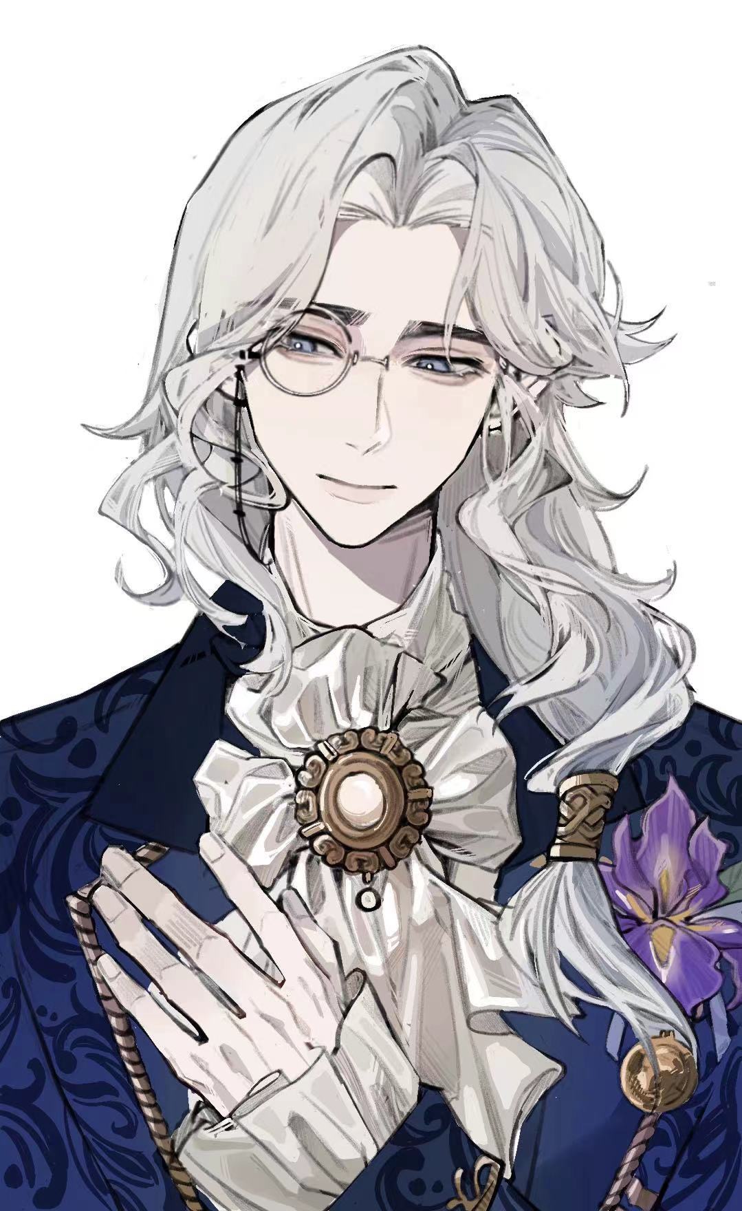 1boy alva_lorenz alva_lorenz_(orientation_day) ascot brooch closed_mouth eyelashes fingernails flower flower_brooch gem grey_eyes grey_hair highres identity_v jewelry lapels light_smile lips long_hair long_sleeves looking_to_the_side male_focus monocle parted_bangs purple_flower solo upper_body white_ascot white_background white_gem xiao_chanmao_ban_fan_fan