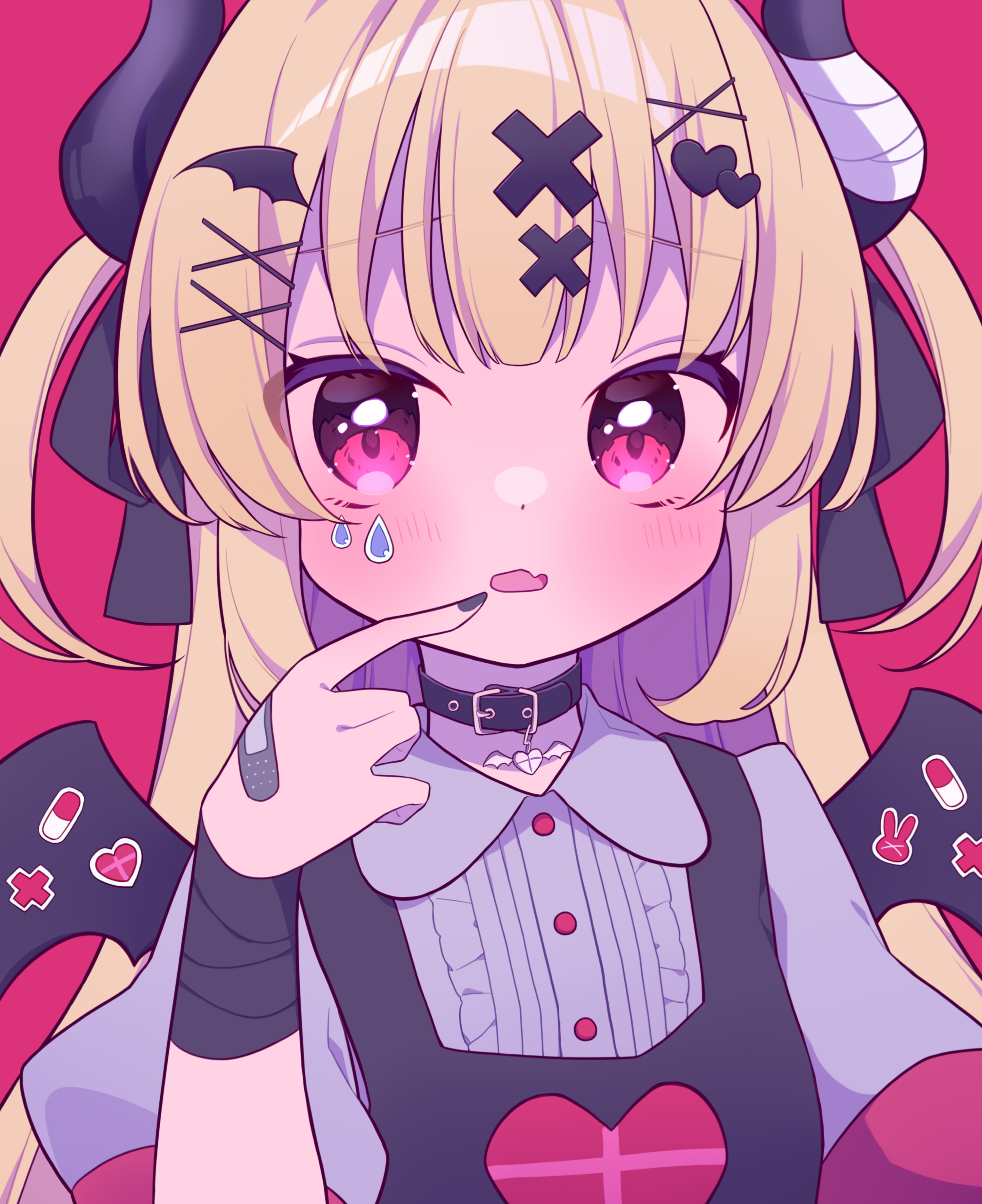 1girl absurdres apron bandaged_arm bandaged_horn bandages bandaid belt_collar black_apron black_collar black_eyes black_horns black_nails black_ribbon black_wings blonde_hair blush collar collared_shirt demon_horns demon_wings fang grey_shirt hair_ornament hair_ribbon heart heart_print highres horns long_hair looking_at_viewer multicolored_eyes natori_sana natori_sana_(devil_natori) open_mouth pink_eyes red_background ribbon sana_channel shirt solo teardrop umecha_0 virtual_youtuber wings x_hair_ornament
