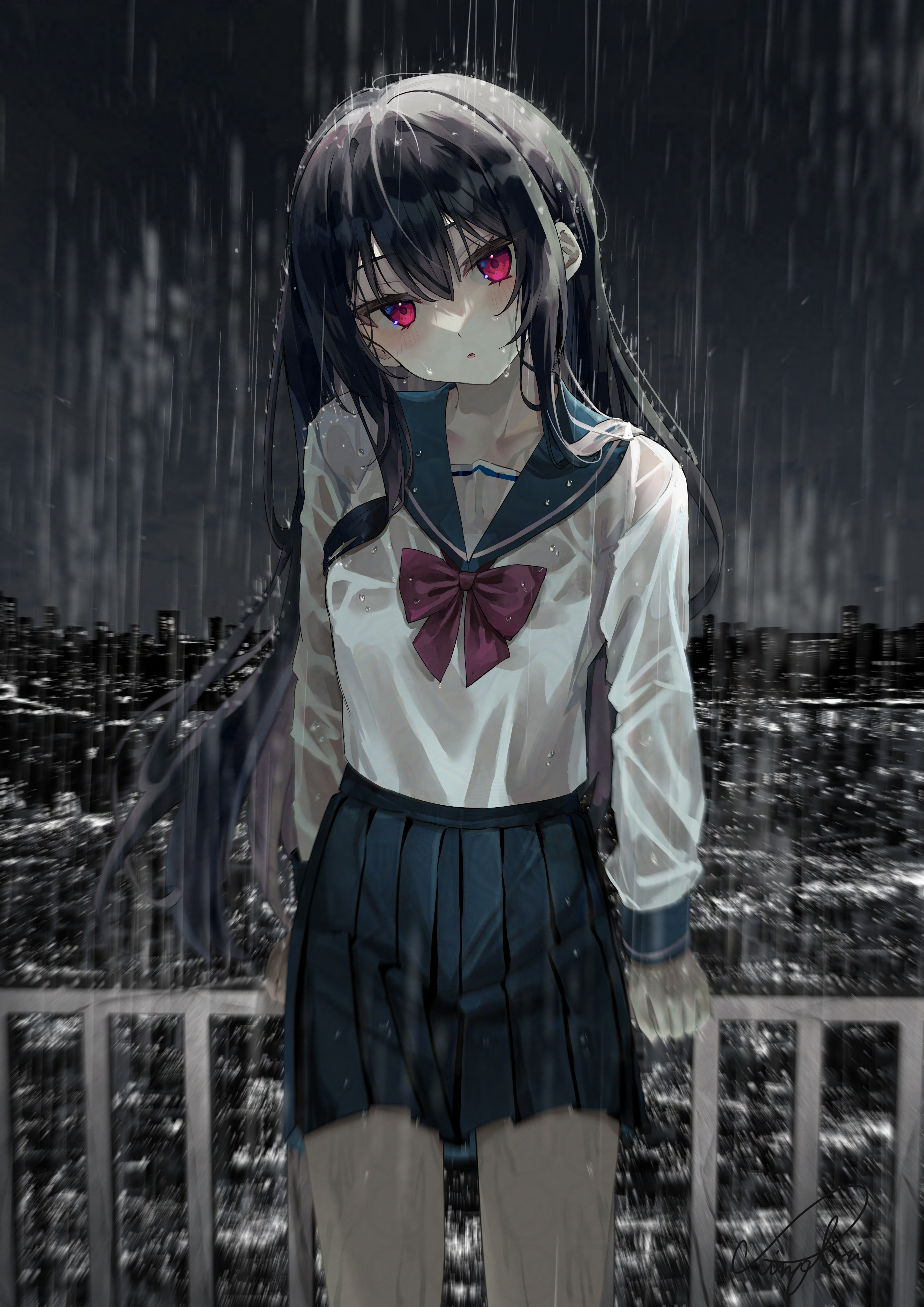 1girl absurdres adversarial_noise black_hair blue_sailor_collar blue_skirt bow bowtie cityscape highres long_hair long_sleeves looking_at_viewer original pleated_skirt railing rain red_bow red_bowtie red_eyes sailor_collar school_uniform serafuku shirt sinobi_illust skirt solo standing wet white_shirt