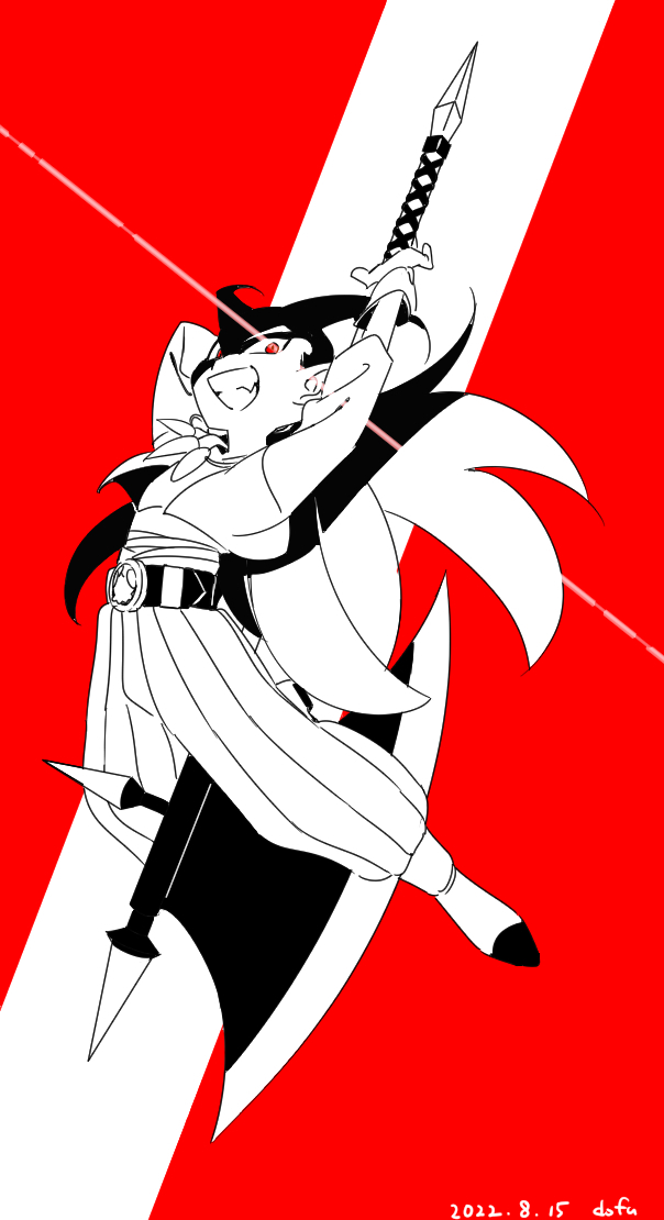 1boy arms_up artist_name axe boots commentary_request dated doofuf dragon_quest dragon_quest_builders_2 eye_trail floating_clothes floating_hair gloves grin hair_horns high-waist_pants holding holding_axe holding_weapon jewelry light_trail looking_at_viewer low_ponytail male_focus necklace open_clothes open_shirt pants ponytail red_eyes sidoh_(dqb2) smile solo spiked_hair spot_color striped_clothes striped_pants tooth_necklace weapon