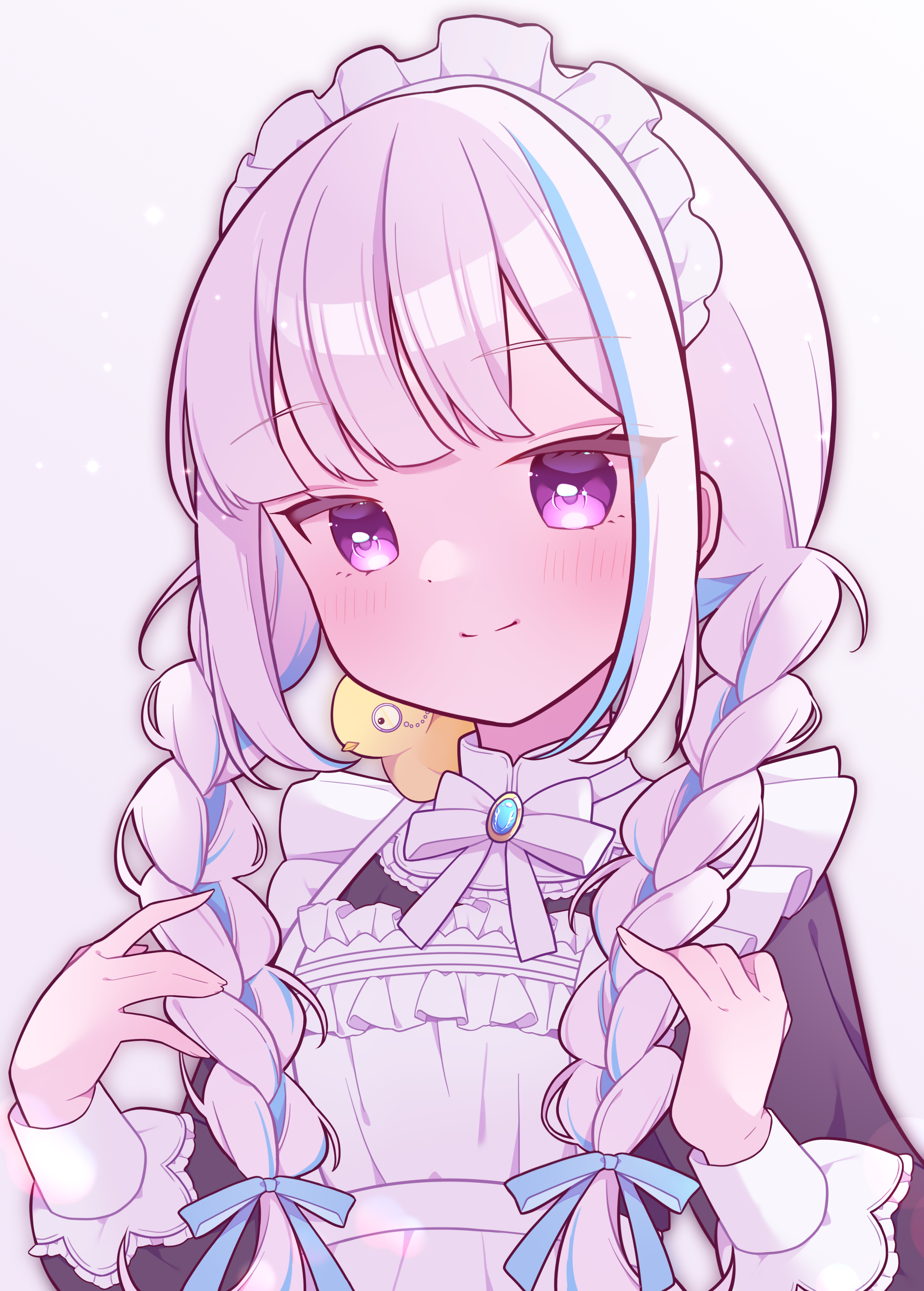 1girl absurdres apron baby_animal bird blue_hair blue_ribbon blush braid chick closed_mouth frilled_apron frills hair_ribbon highres lize_helesta maid maid_headdress multicolored_hair neck_ribbon nijisanji purple_eyes ribbon solo streaked_hair twin_braids two-tone_hair umecha_0 virtual_youtuber white_background white_hair white_ribbon