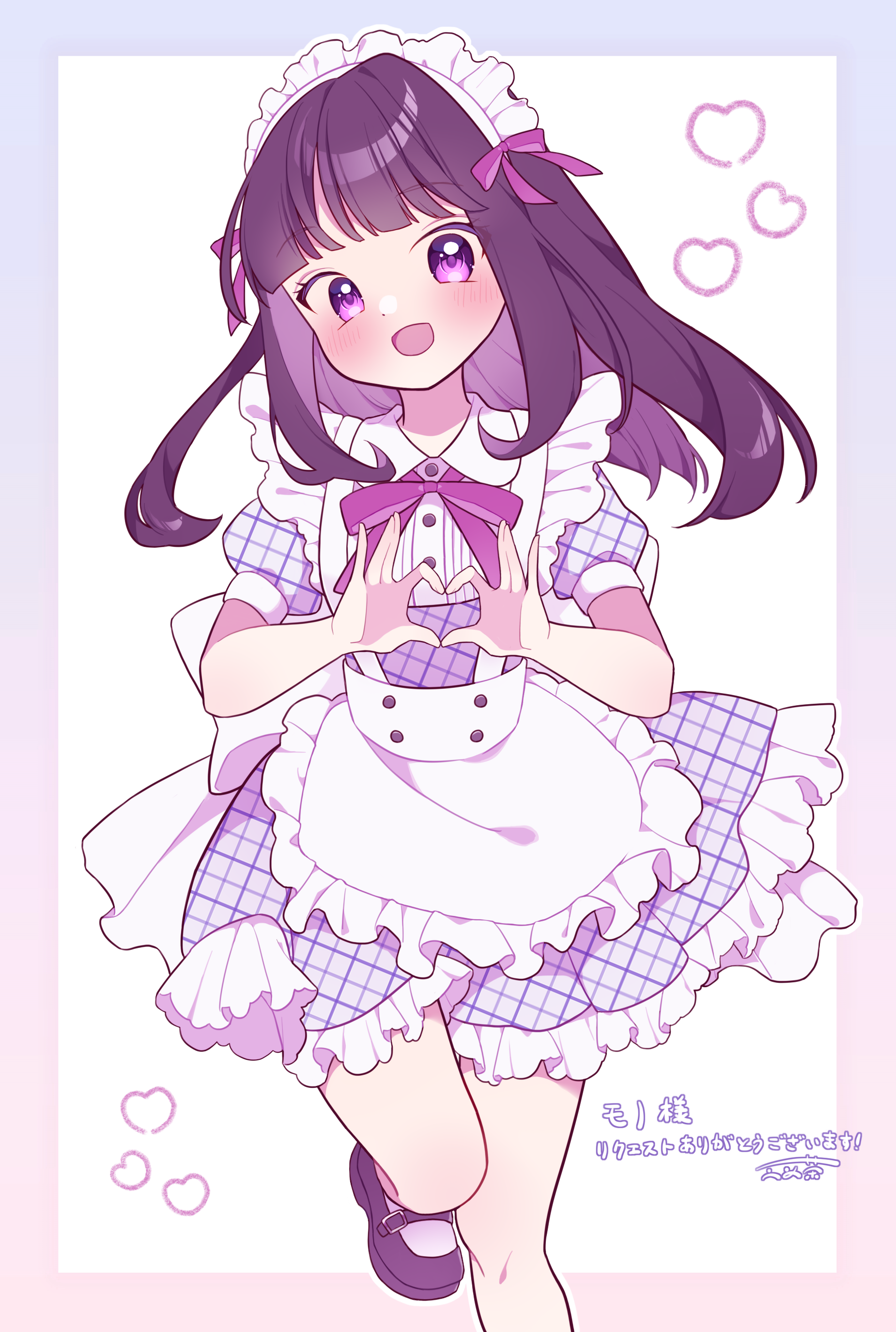 1girl absurdres apron black_footwear blue_border blush border bow bowtie colored_inner_hair commission dress frilled_dress frills gradient_border hair_bow heart heart_hands highres looking_at_viewer maid maid_apron maid_headdress multicolored_border multicolored_hair open_mouth original outside_border pink_border purple_bow purple_bowtie purple_eyes purple_hair signature skeb_commission solo umecha_0