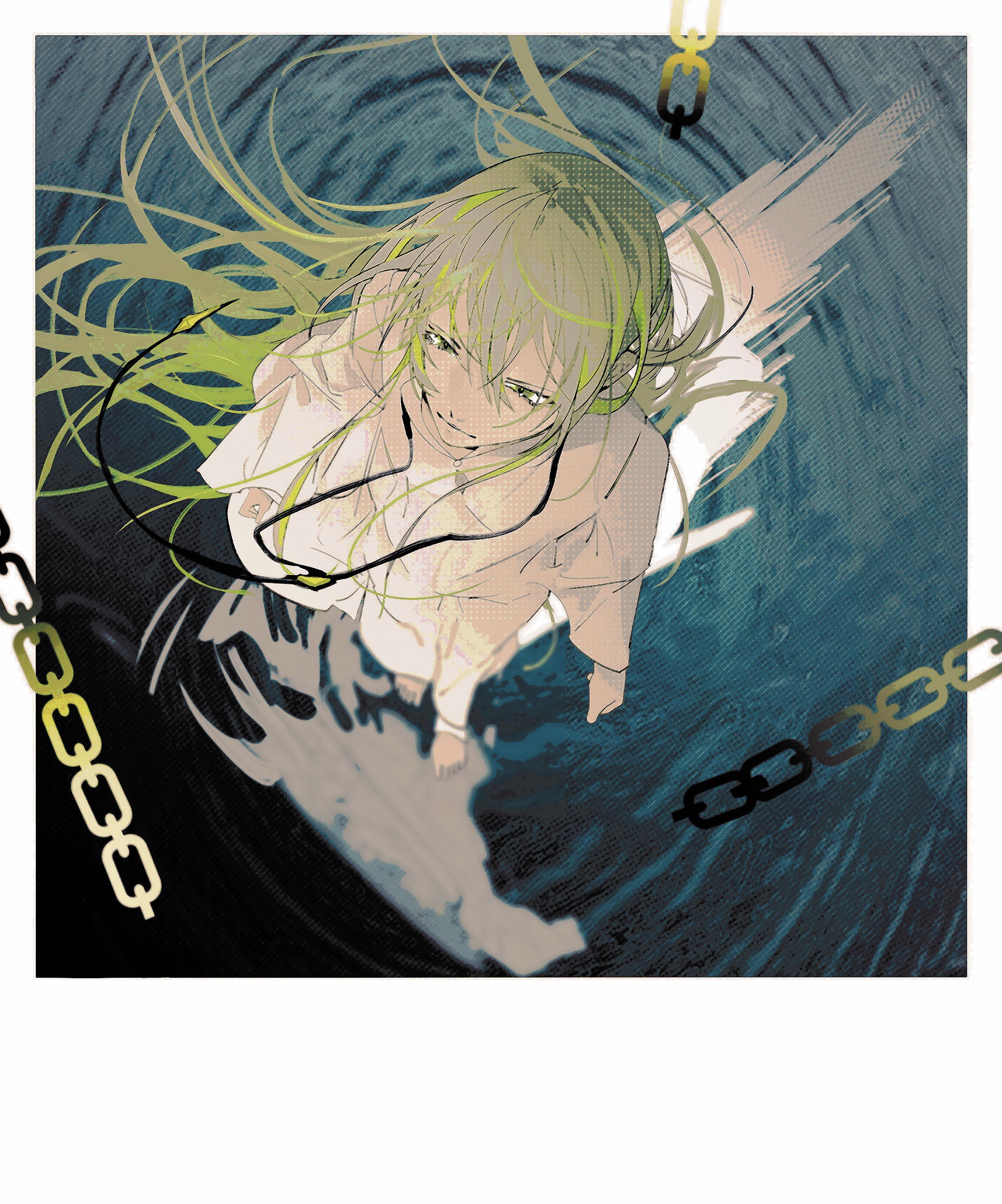 1boy absurdly_long_hair absurdres barefoot border chain chinese_commentary closed_mouth collared_shirt commentary_request enkidu_(fate) fate/grand_order fate_(series) feet floating_hair from_above full_body green_eyes green_hair hair_between_eyes highres light_smile long_hair long_sleeves looking_at_viewer looking_up male_focus pants point3q ripples shirt solo toes very_long_hair walking walking_on_liquid water white_border white_pants white_shirt