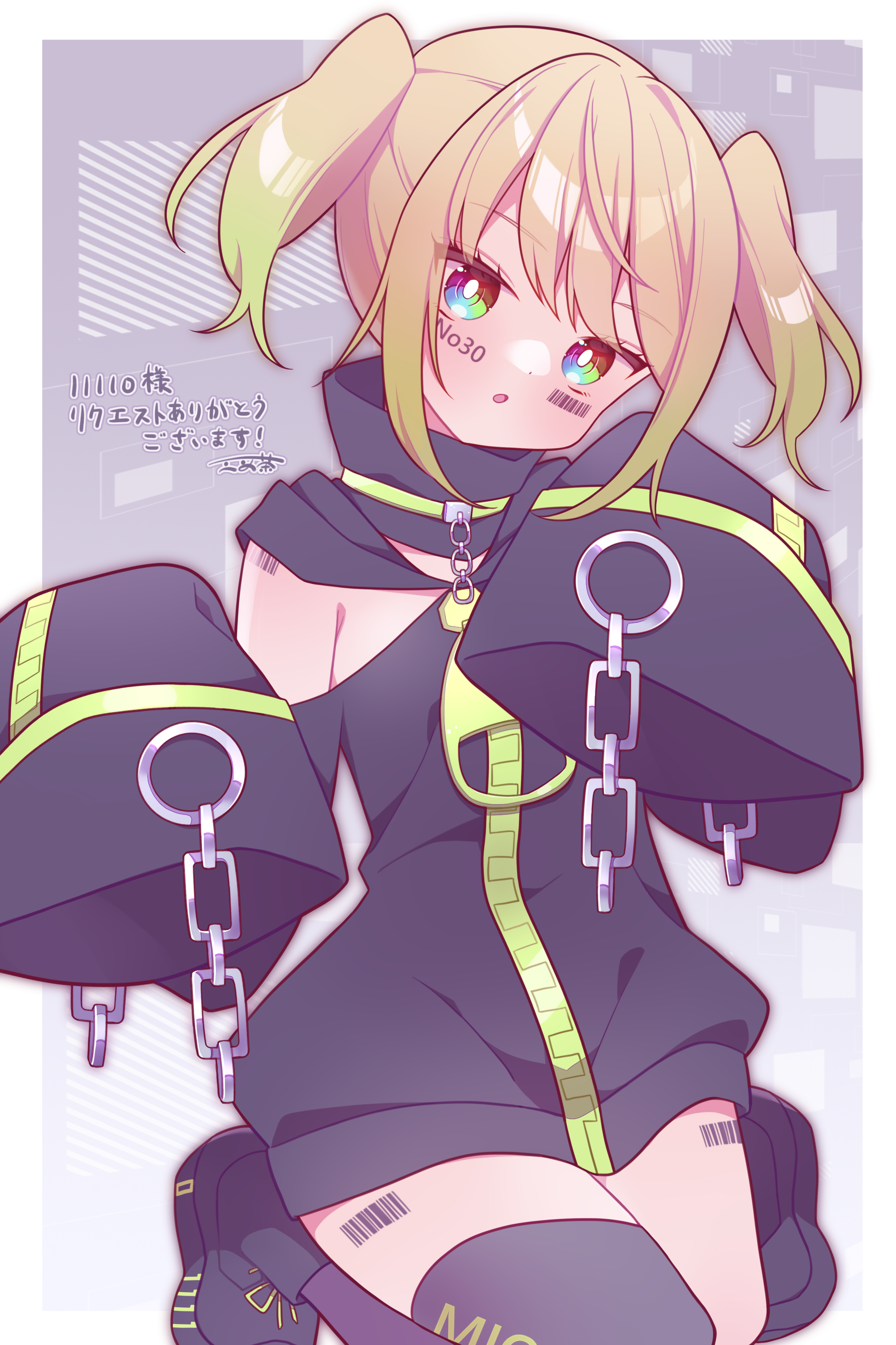 1girl absurdres barcode barcode_tattoo black_eyes black_shoes blonde_hair blue_eyes border commission facial_tattoo gradient_hair green_eyes green_hair grey_thighhighs highres leg_tattoo looking_at_viewer multicolored_eyes multicolored_hair open_mouth original outside_border oversized_clothes oversized_shirt purple_eyes shirt shoes shoulder_tattoo signature skeb_commission sleeves_past_fingers sleeves_past_wrists solo tattoo thighhighs two-tone_hair two_side_up umecha_0 white_border