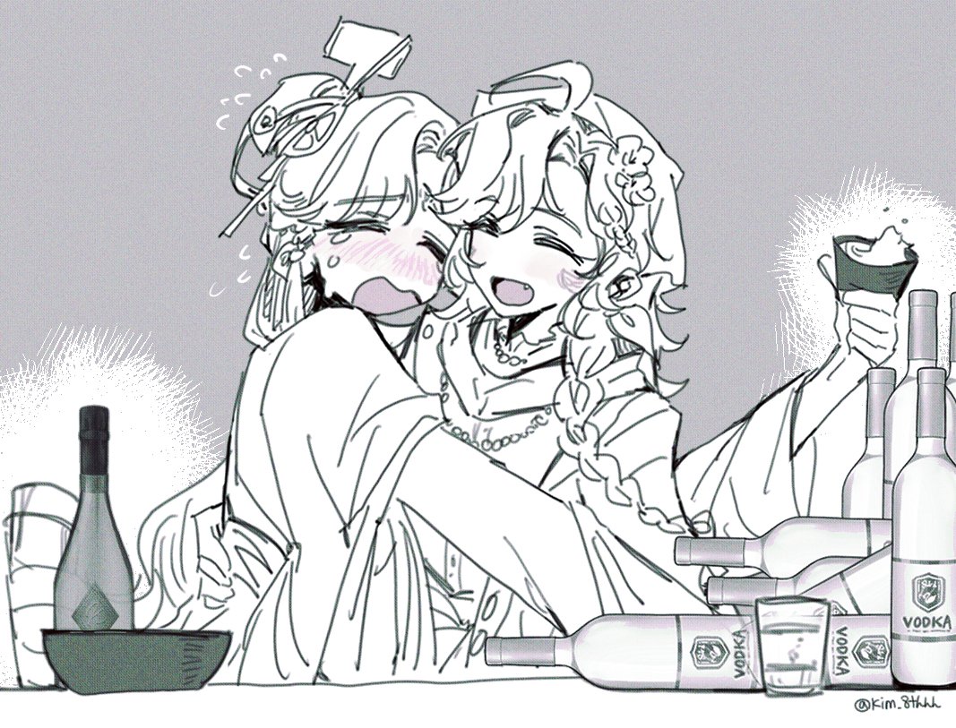 2girls :d ^_^ ahoge alcohol arm_around_back bottle bowl closed_eyes cup drinking_glass drunk fang flying_sweatdrops glass_bottle greyscale hair_bun hand_up heads_together holding holding_cup hug jiu_niangzi kim_8thhh long_hair long_sleeves monochrome multiple_girls open_mouth reverse:1999 shirt single_side_bun smile spot_color teardrop twitter_username upper_body vodka