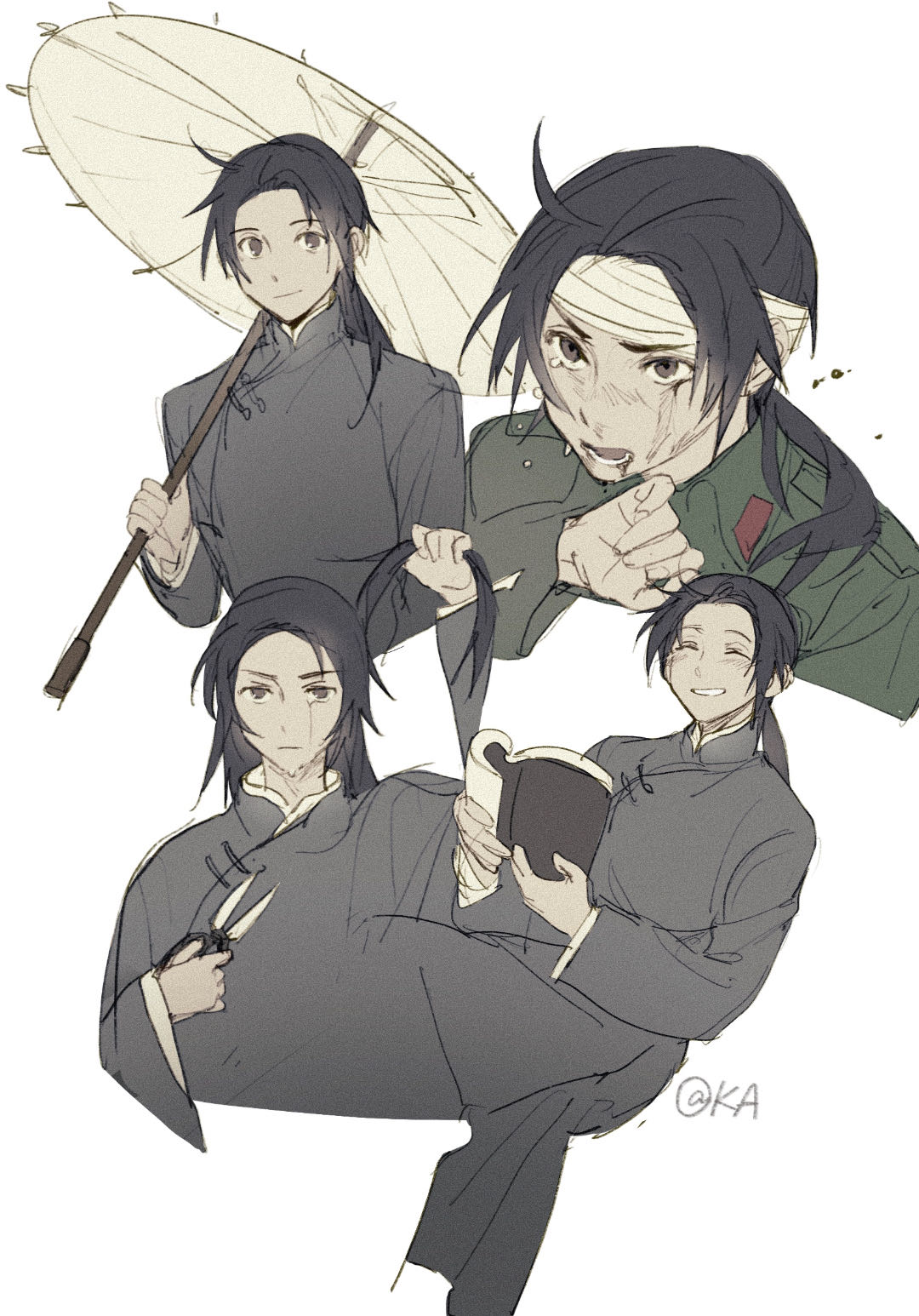 1boy axis_powers_hetalia bandaged_head bandages black_eyes black_hair black_shirt book changpao china_(hetalia) chinese_clothes closed_eyes closed_mouth collared_jacket commentary_request crying crying_with_eyes_open disappearoften green_jacket hand_up highres holding holding_book holding_own_hair holding_scissors holding_umbrella injury jacket long_hair long_sleeves looking_afar looking_at_viewer mandarin_collar military_jacket military_uniform oil-paper_umbrella open_book open_mouth pocket ponytail scissors shirt sidelocks simple_background smile tears teeth umbrella white_background wide_sleeves