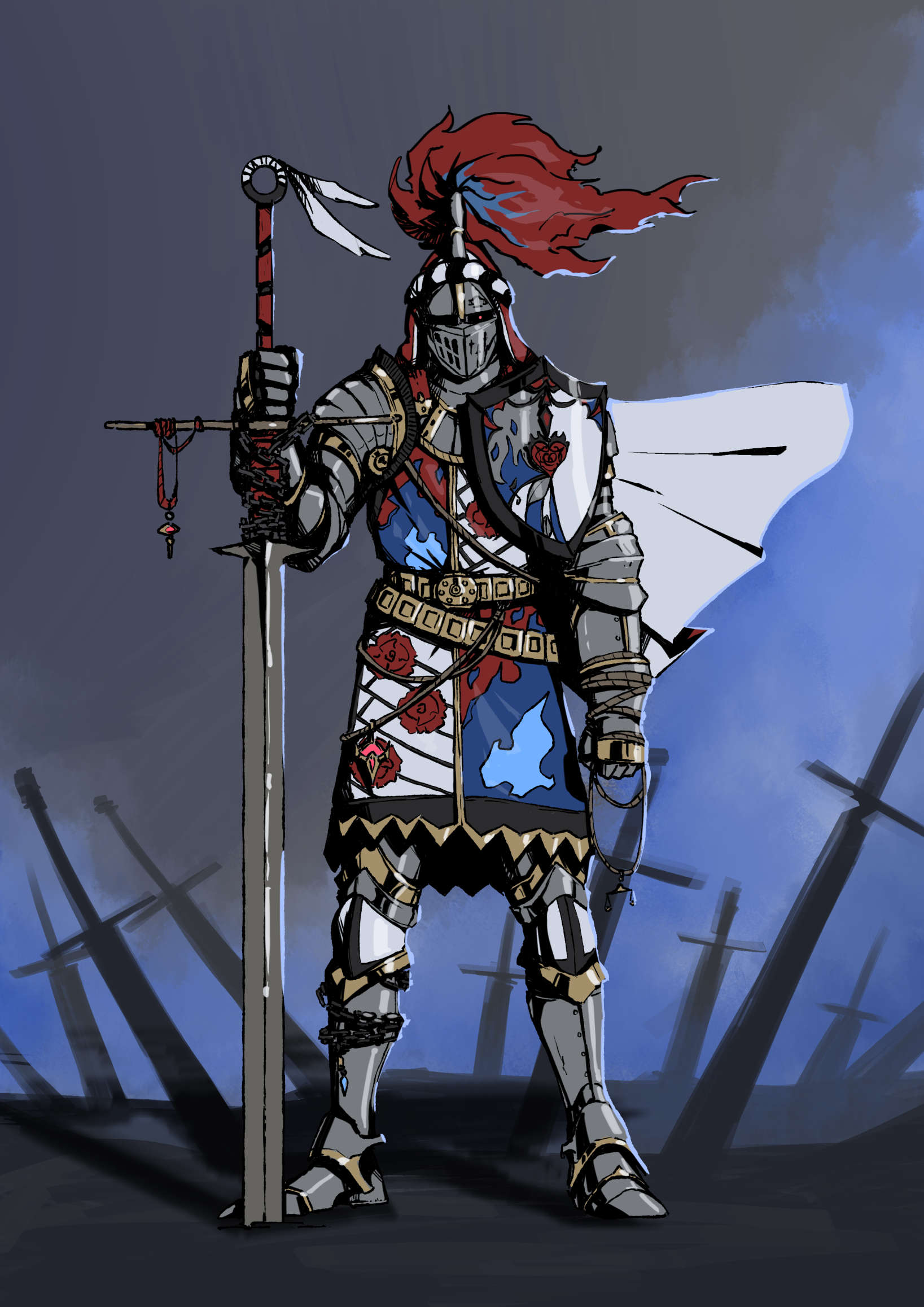 armor breastplate couter cuirass cuisses elizabeth_rose_bloodflame faulds feaurievladskov full_armor gauntlets greaves helmet highres hololive hololive_english knight pauldrons plate_armor plume rosarian_(elizabeth_rose_bloodflame) shoulder_armor solo standing sword virtual_youtuber weapon weighing_scale zweihander