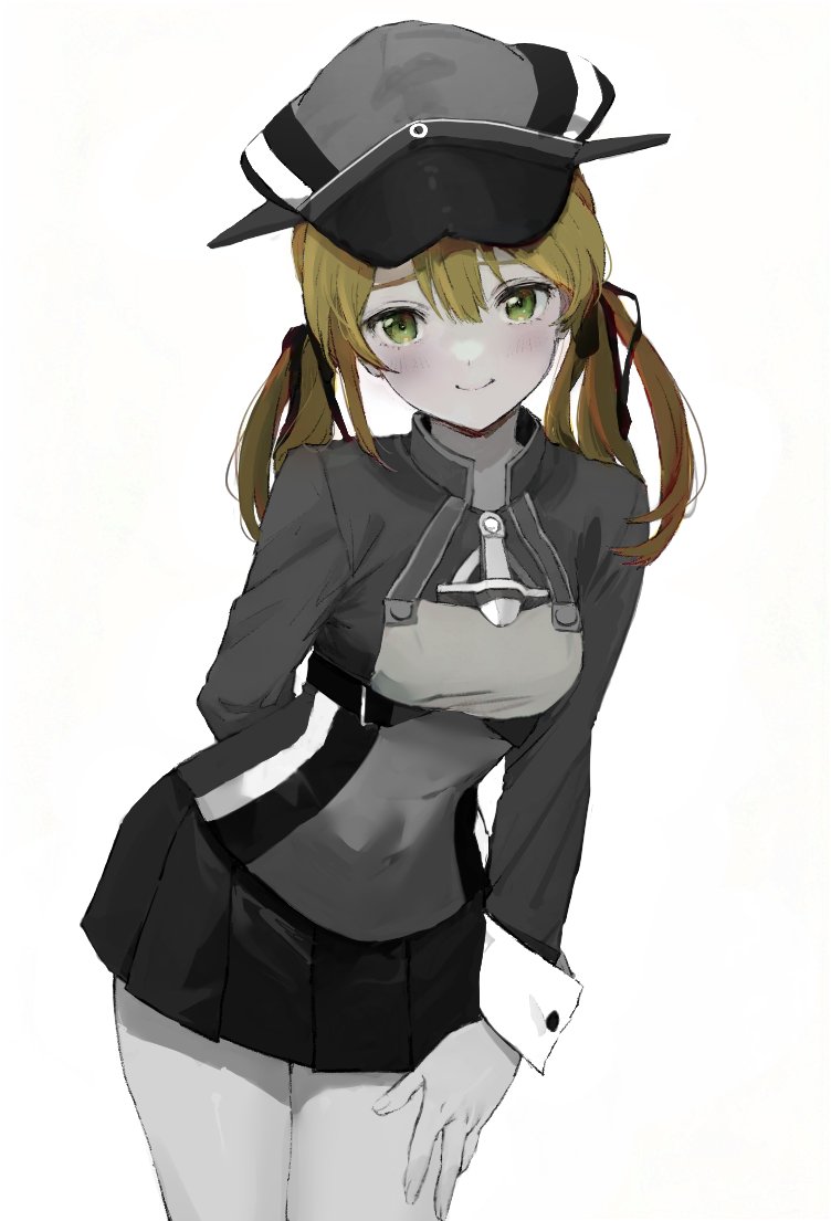 1girl anchor_hair_ornament armor blonde_hair breastplate breasts green_eyes greyscale hair_ornament hat kantai_collection looking_at_viewer low_twintails medium_breasts microskirt military_hat military_uniform monochrome neju peaked_cap pleated_skirt prinz_eugen_(kancolle) skirt smile solo spot_color twintails